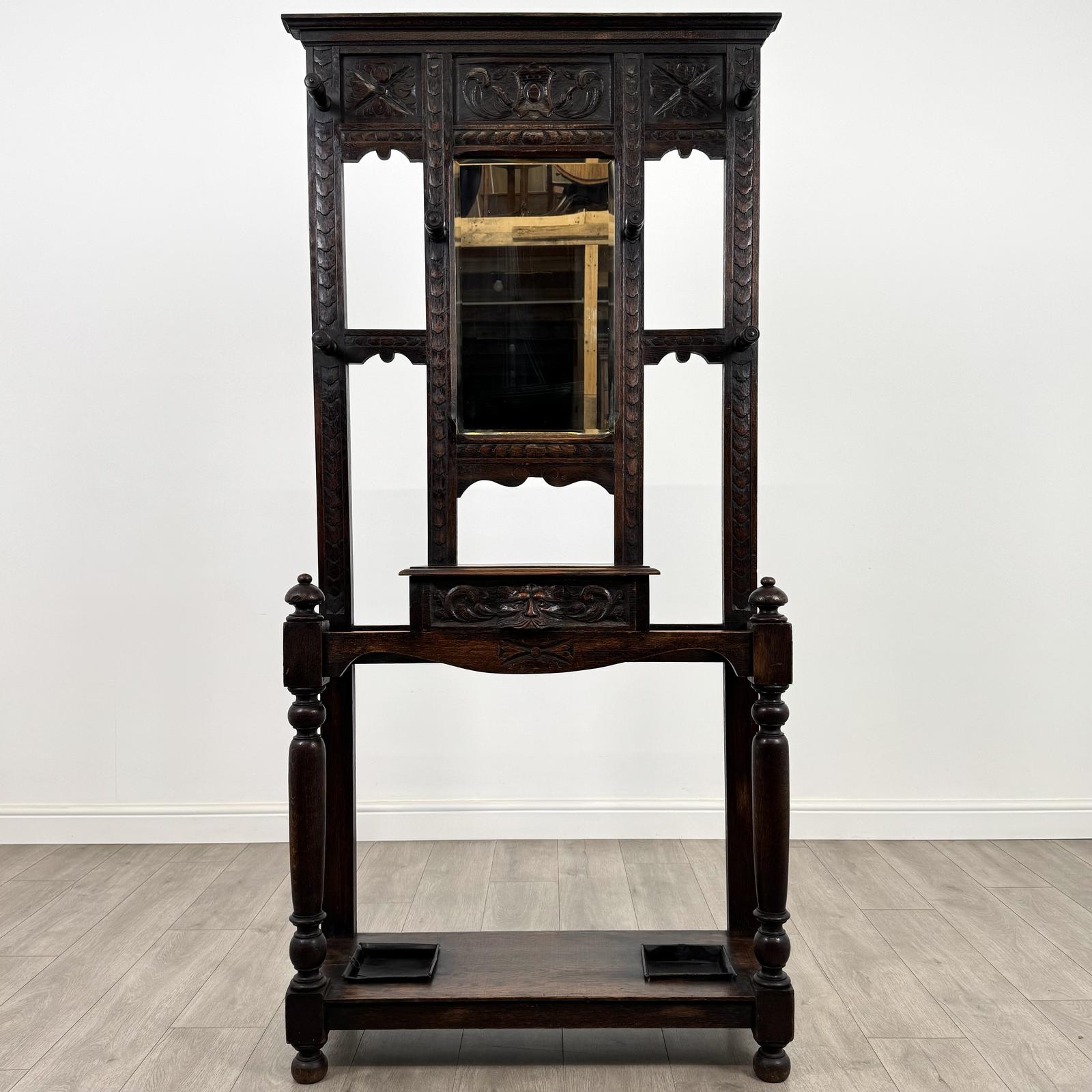 The oak displays gorgeous grain and rich colour throughout, with a high level of attention to detail evident in every carving. Very well made and solidly constructed, this hall stand is presented in great condition.