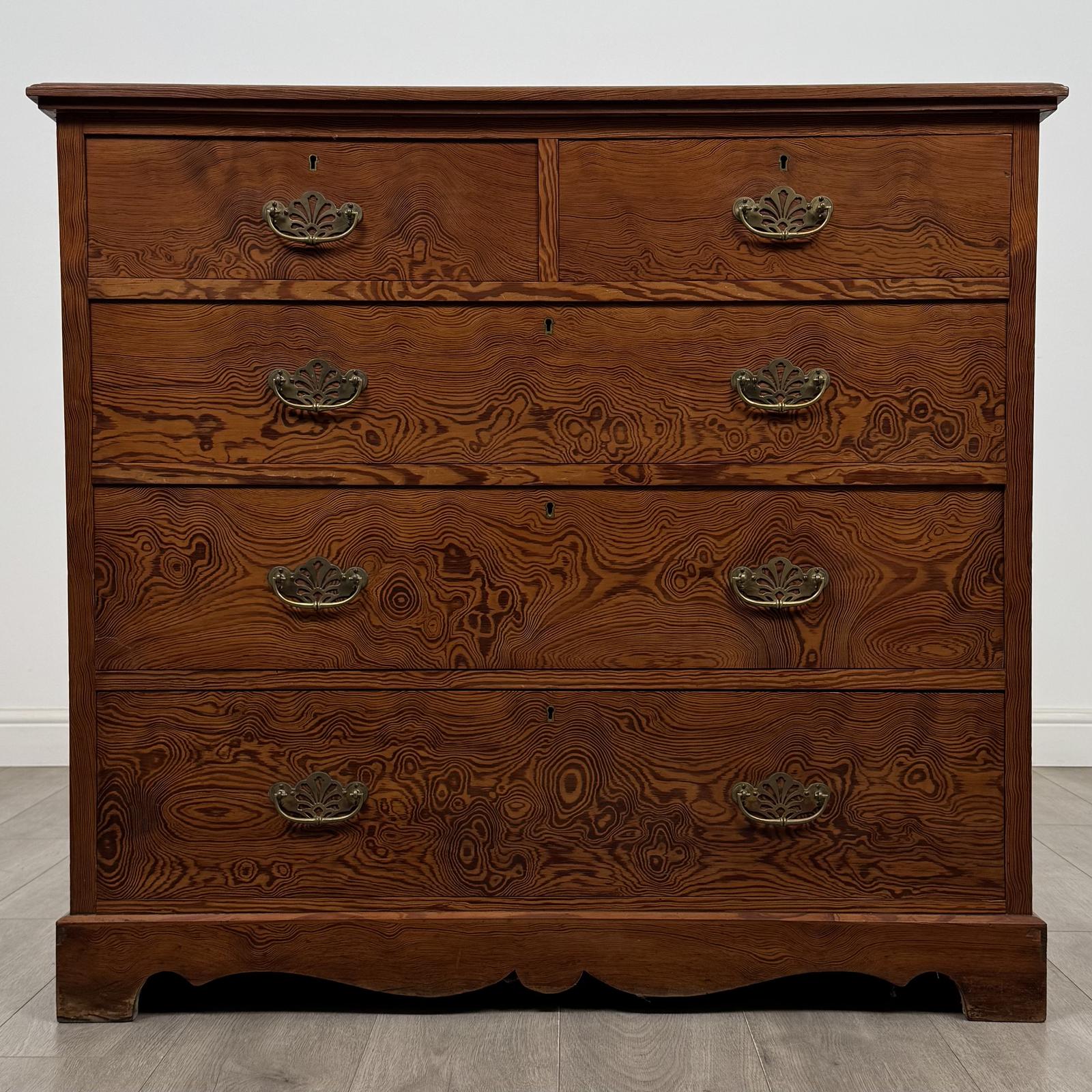 Antique 19th Century Figured Pitch Pine Chest Of Drawers