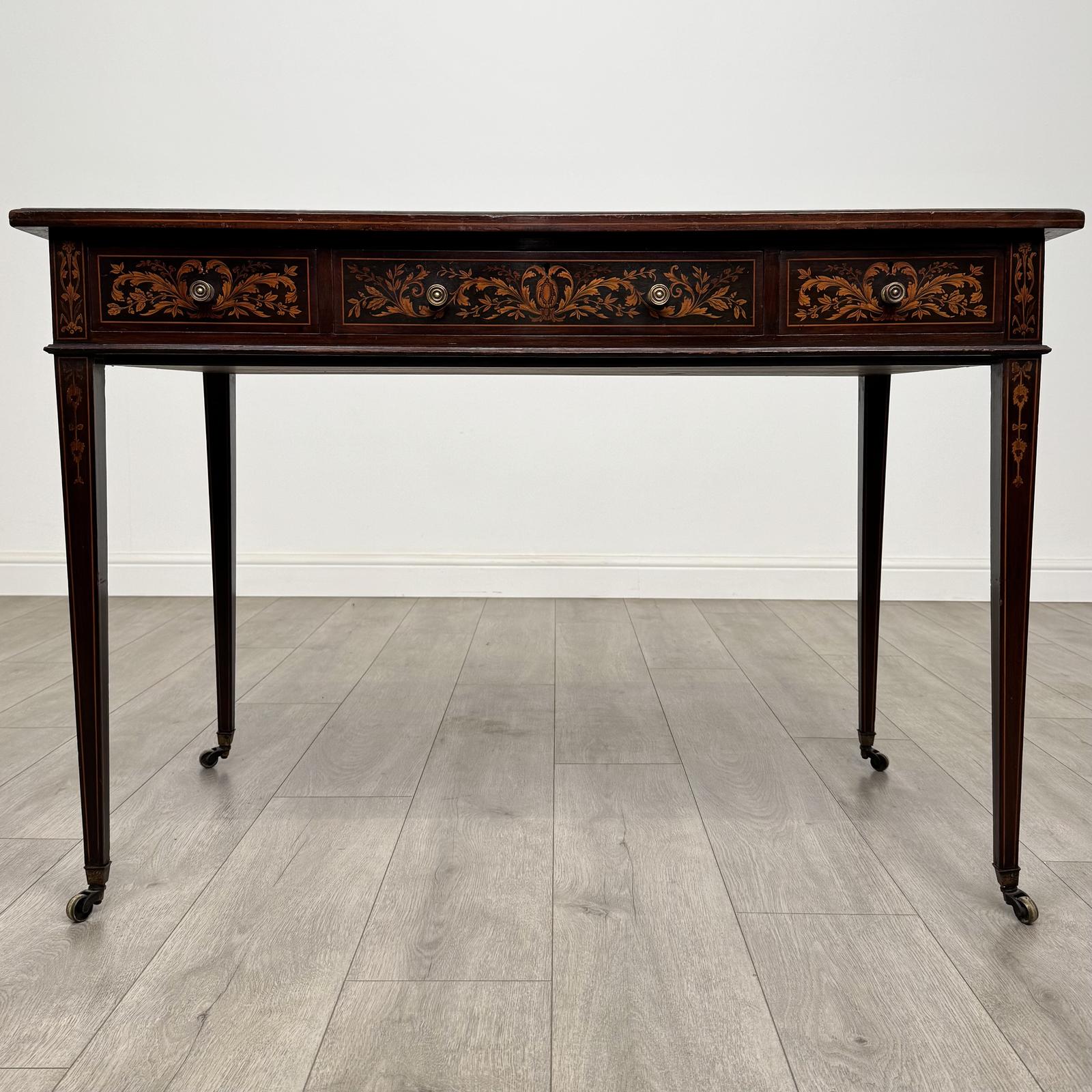 The table features three drawers to the front, all retaining their original brass knob handles, and a beautiful green leather writing surface. The piece is inlaid throughout with fine satinwood stringing, while the drawer fronts and desk surface are exquisitely decorated with various woods, forming intricate patterns and delicate floral designs.