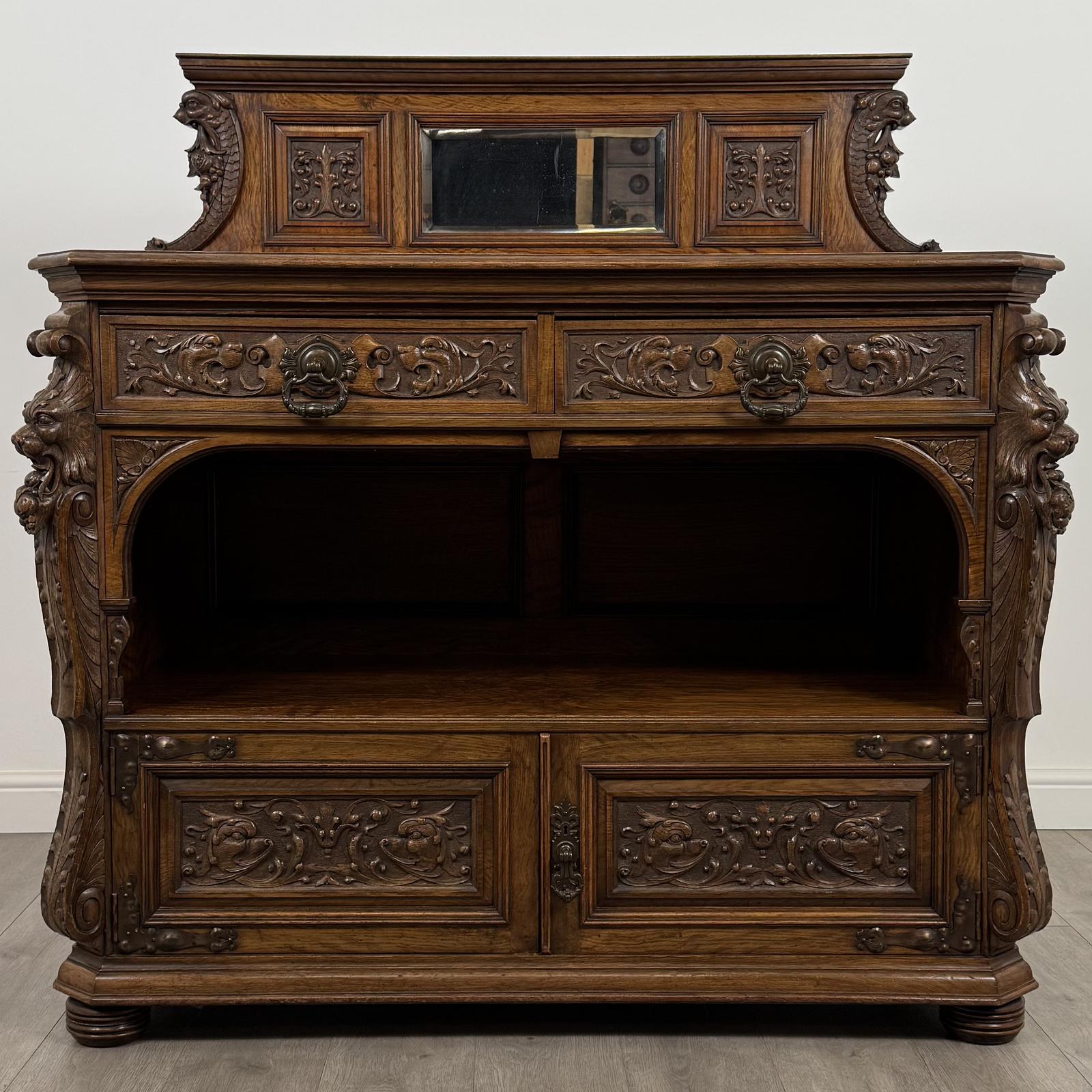 Beautifully carved with the finest attention to detail, the sideboard features a raised gallery to the top with a central bevel-edged mirror, two central drawers retaining their original handles, an open shelf below, and a double-door cupboard to the base, offering both decorative appeal and practical storage. Presented in great condition, this remarkable sideboard is a stunning piece of history and a statement item, making a perfect addition to any home.
