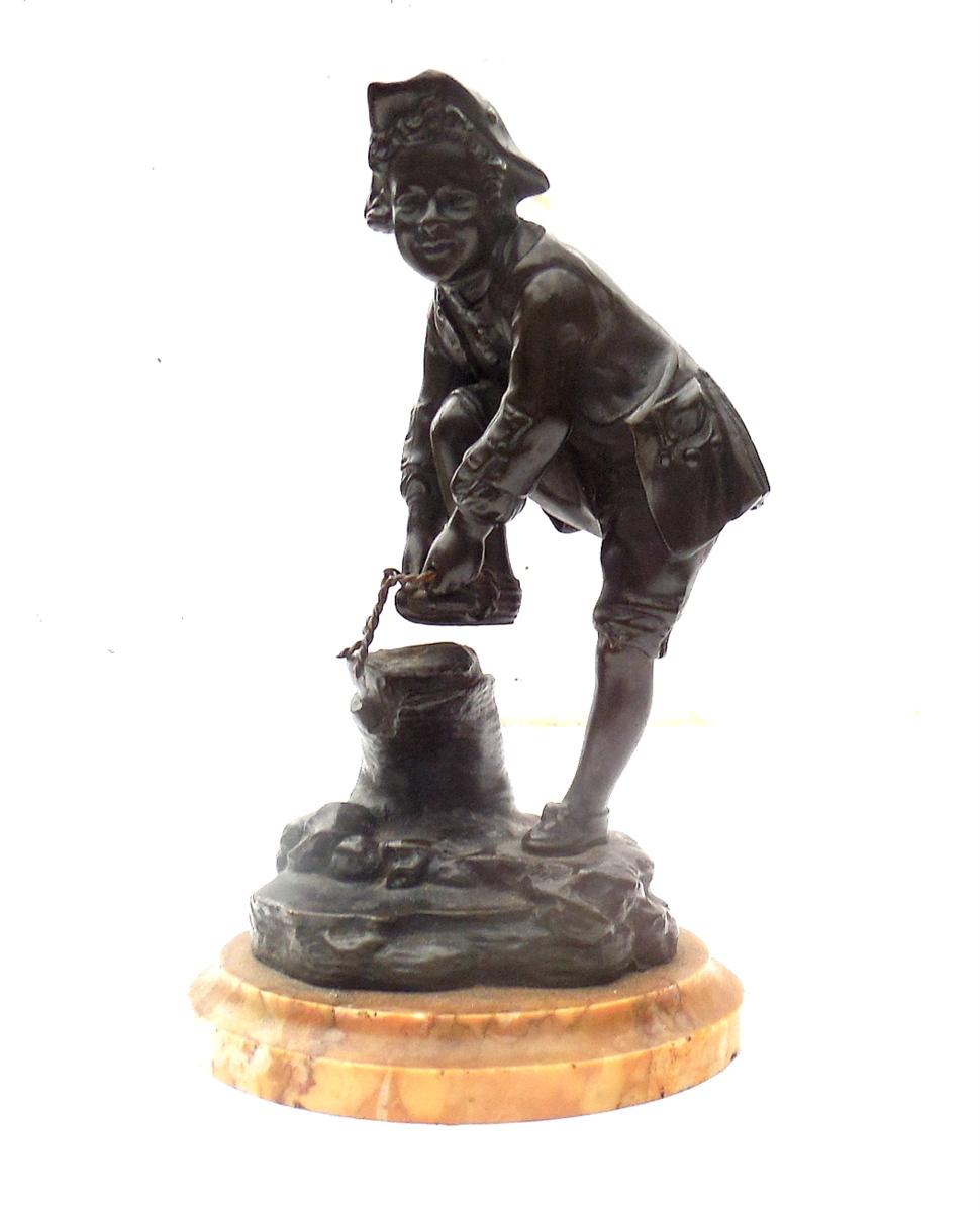 For sale is this beautiful antique bronze statue of an ice skater. I believe it is French in origin, and was cast in the second half of the 19th century, probably around 1875. The subject is a young man in 18th century costume with a tricorn hat putting on one of his skates. The figurine stands on a circular sienna marble base. The total height of the bronze is 19 centimeters. The diameter of the base is 11.5 centimeters. Total weight of the sculpture is 1,782 grams. The condition is excellent with no losses or breaks. A dark olive green patina covering the bronze makes this a very attractive bronze indeed! Minor scratching and soiling to the marble base.
