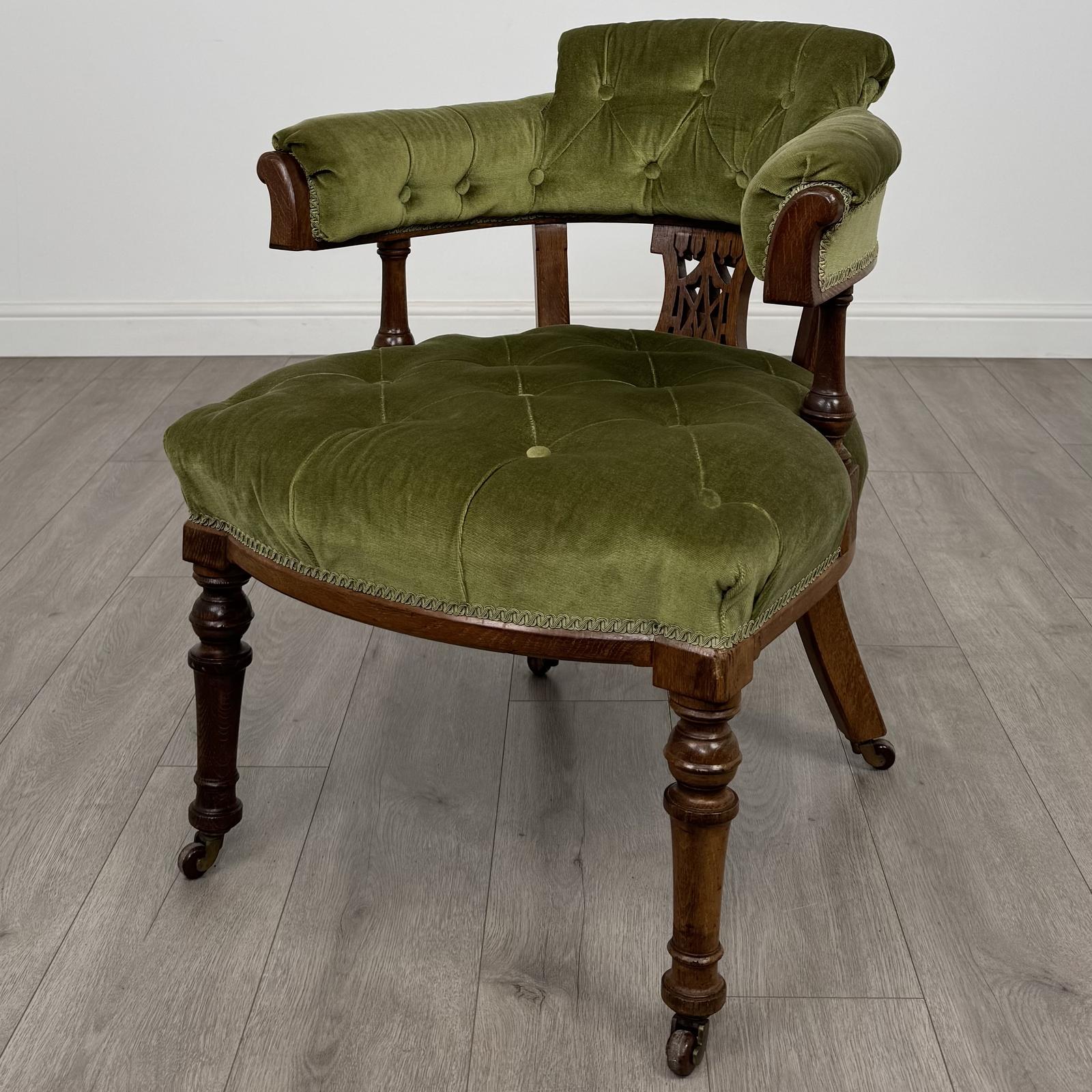 Antique 19th century good quality oak tub chair, beautifully crafted and very well made. Stood on turned legs with casters, featuring a button-back green upholstery that is both comfortable and stylish. Nicely shaped with a solid frame and sturdy construction, showcasing gorgeous oak grain and rich colour throughout.