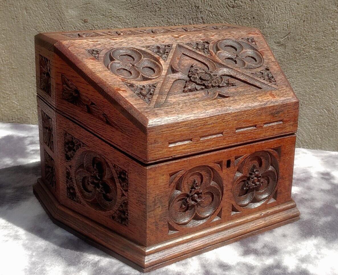 Antique 19th Century Gothic Church Ecclesiastical Carved Oak Wood Stationery Box