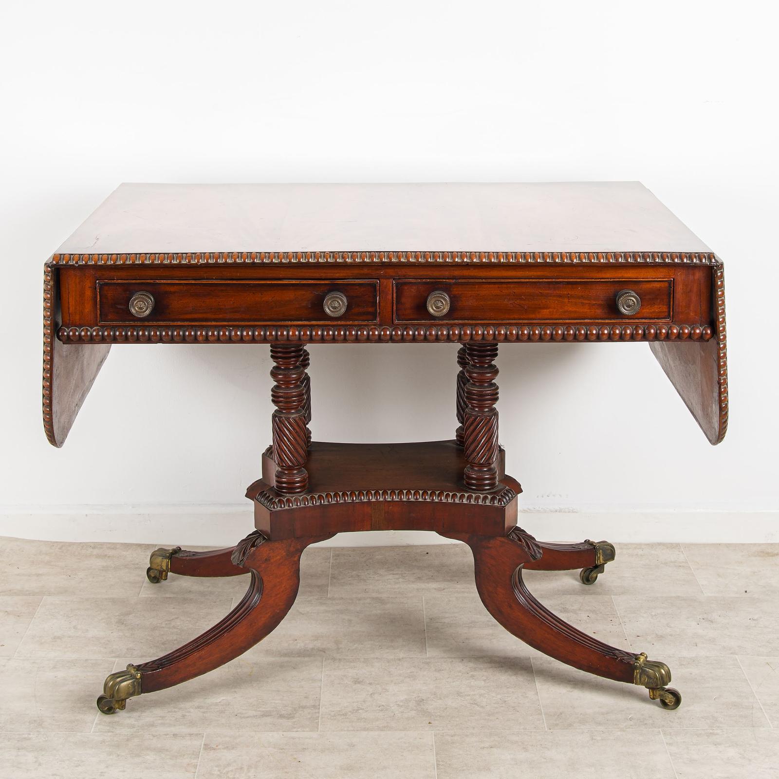 A highly functional and decorative antique mahogany sofa table, ideal for traditional or contemporary interiors.