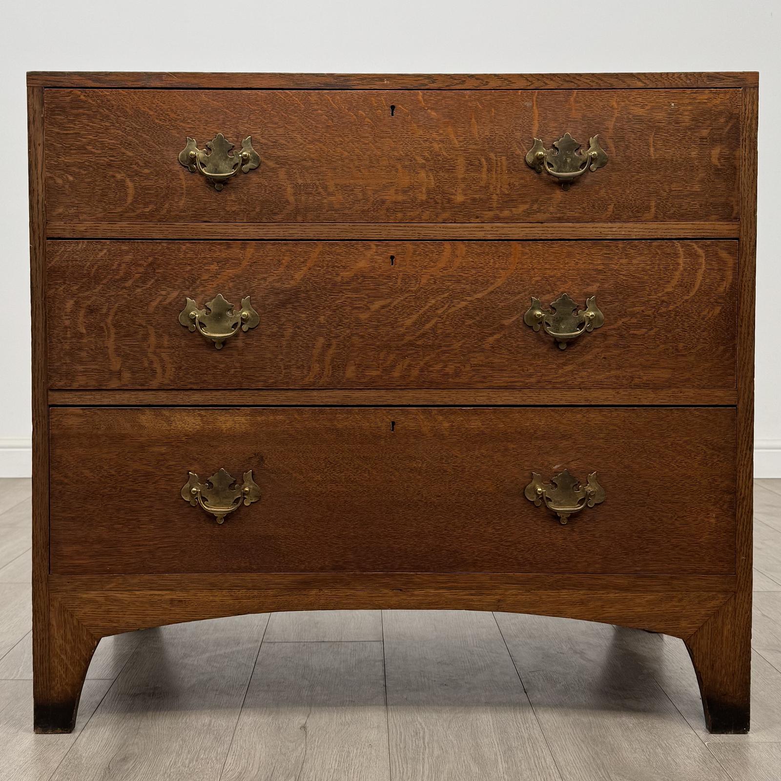 The chest features three front drawers, each fitted with decorative brass handles, providing practical and elegant storage solutions. It displays a gorgeous natural grain with rich colour throughout, highlighting the beauty of the oak and the quality of its construction.