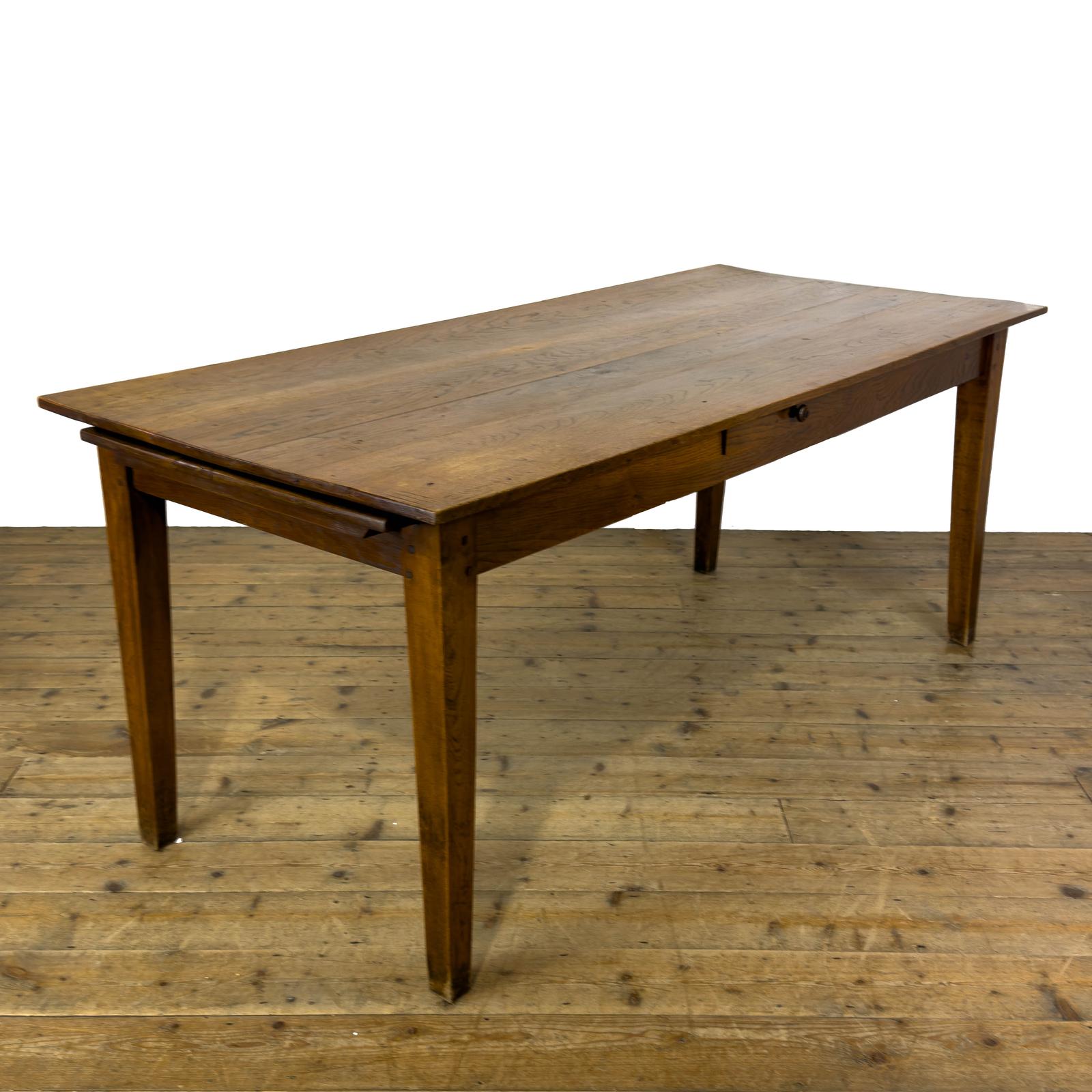 A good 19th century rectangular oak farmhouse table of generous proportions. The table is constructed from solid oak throughout, with a well-figured plank top showing attractive grain and a rich, warm colour. The table is raised on four square tapering legs, joined by a simple frieze, and features traditional pegged construction visible at the joints. To one side, the table is fitted with a single frieze drawer, complete with a small turned wooden knob handle. To the end of the table is the pull-out breadboard-style extension slide, offering additional surface space when required. A sturdy and well-made example, full of character, ideal as a kitchen or dining table.