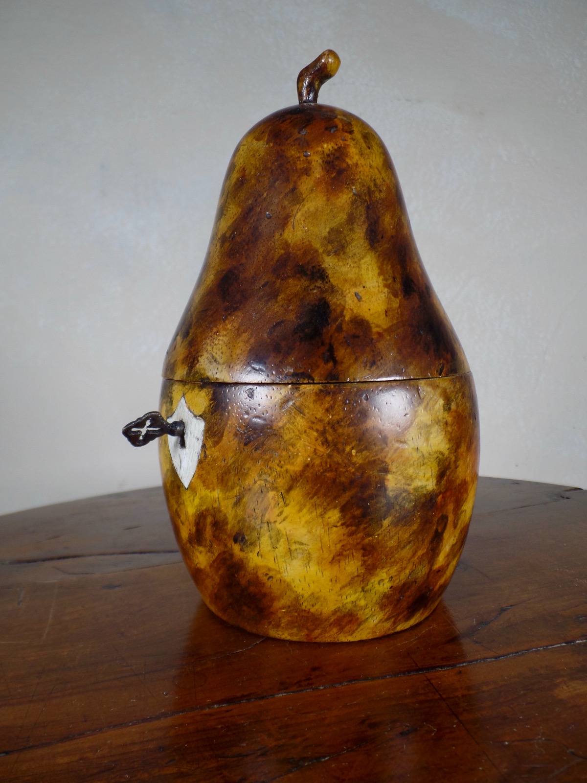 Antique 19th Century Pear Tea Caddy Key Fruitwood Faux Tortoise Shell Decorative Paint