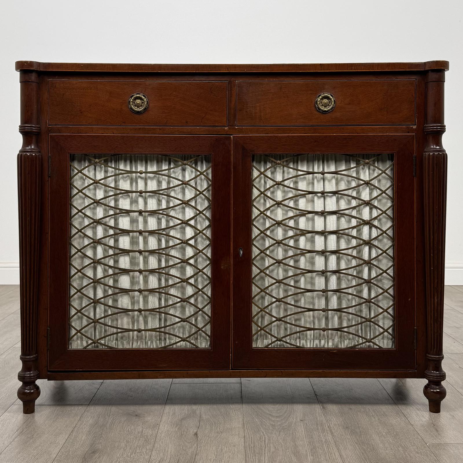 The cupboard features two drawers to the upper section and a double-door cupboard to the base, enclosing a single internal shelf for practical storage. It is beautifully decorated with brass detailing and a curtain to the doors, complemented by reeded decoration throughout.