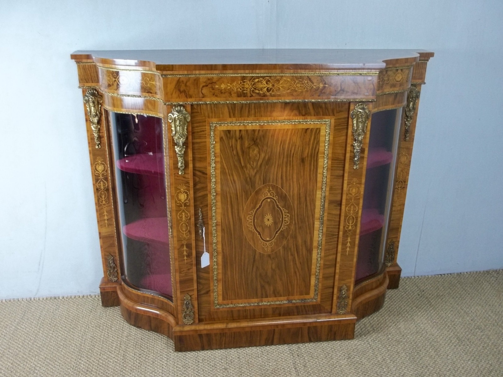 Antique 19th Century Serpentine Shaped Figured Walnut Inlaid Ormolu Mounted Credenza Display Side Pier Sideboard Cabinet