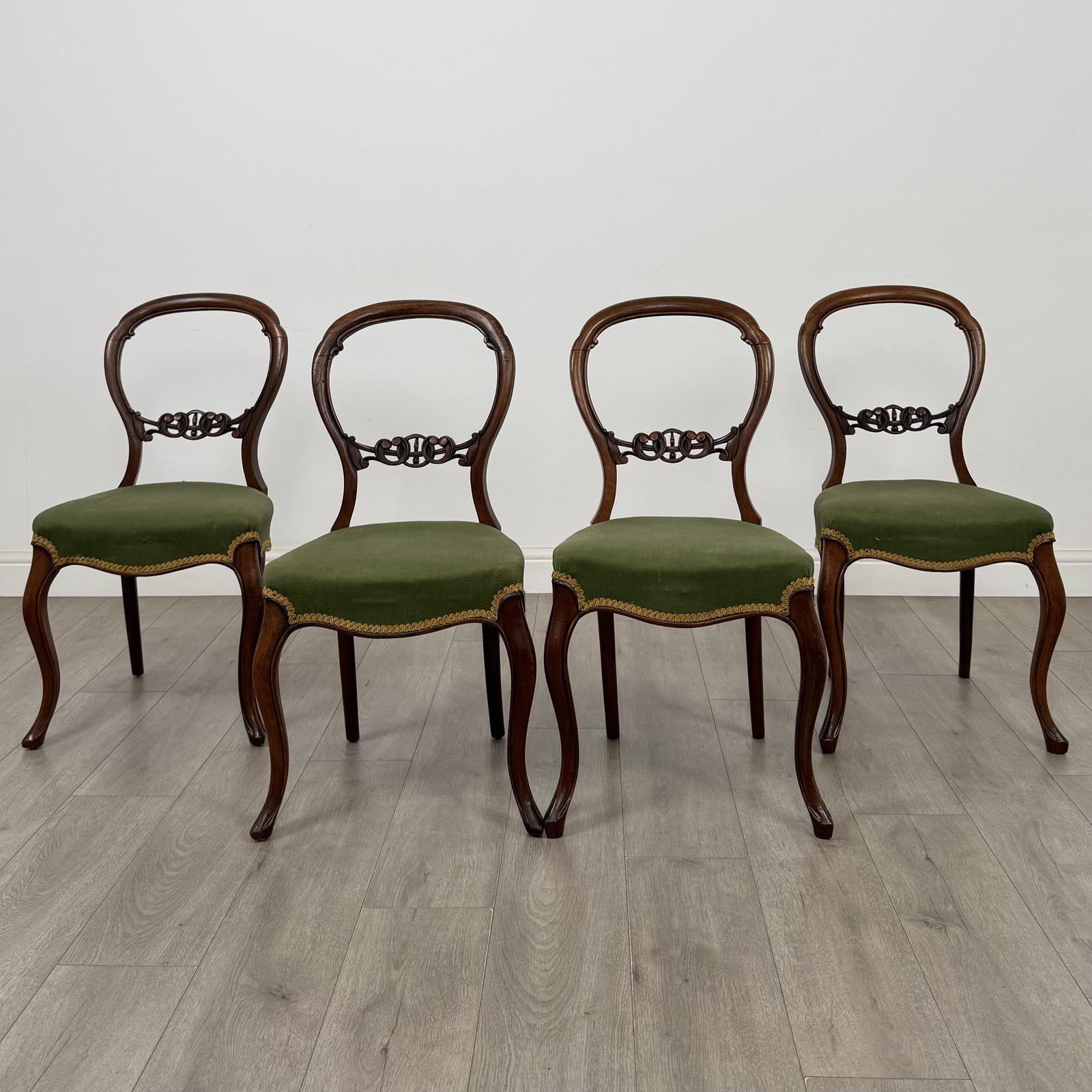 A charming antique 19th century set of four Victorian mahogany dining chairs, very well made and of good quality throughout. This elegant set features beautifully shaped balloon backs with subtle carved detailing, showcasing classic Victorian craftsmanship and style. Each chair is fitted with comfortable overstuffed seats upholstered in a rich green fabric, adding both comfort and decorative appeal. The chairs stand on graceful cabriole legs, enhancing their refined silhouette and period character. The mahogany displays a gorgeous rich colour and natural grain throughout, giving the set a warm and sophisticated presence, with solid frames and well-balanced proportions, these are practical as well as attractive dining chairs.