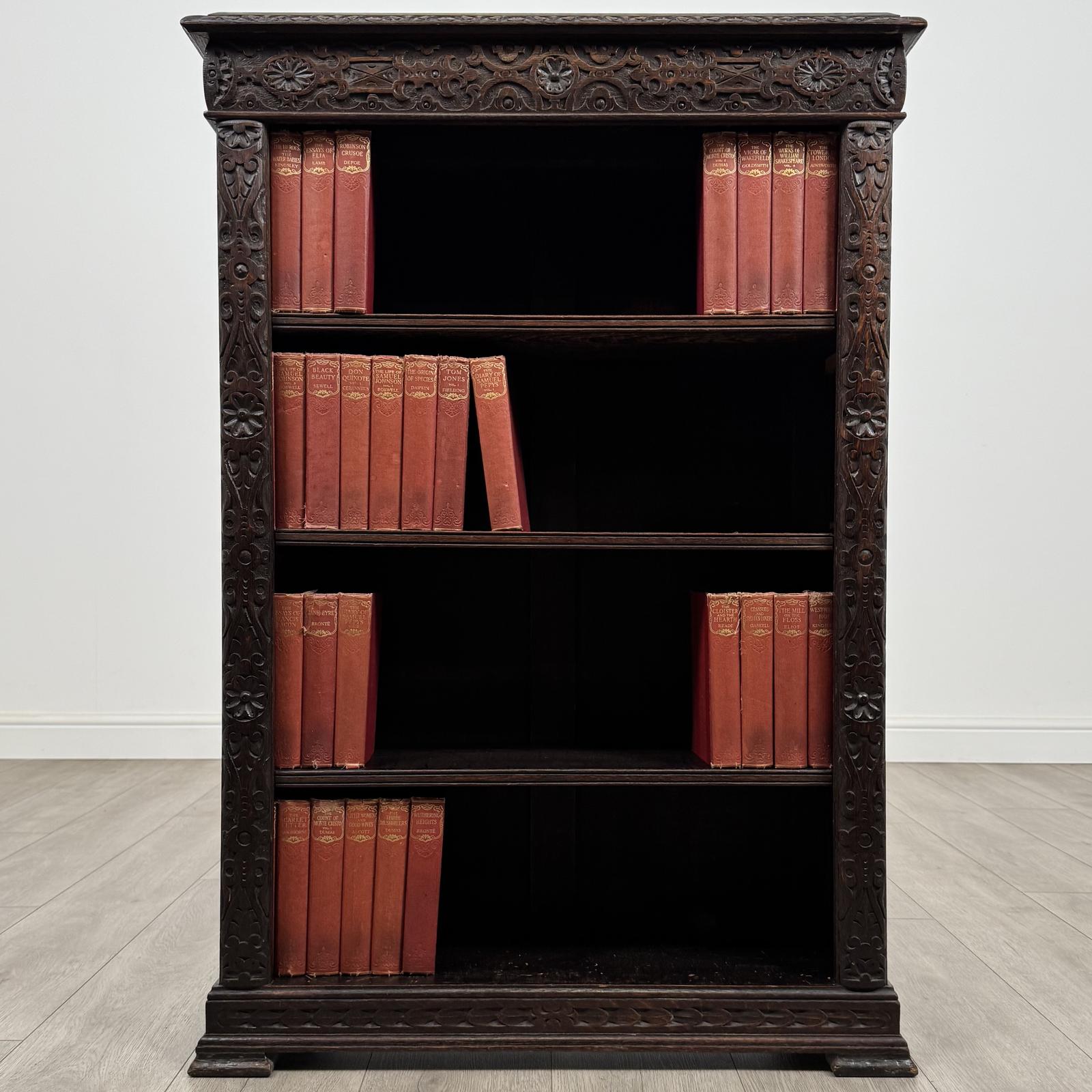 The piece is beautifully carved throughout with highly detailed designs, showcasing superb craftsmanship and adding character and charm. It stands on OJ feet and displays gorgeous grain and rich colour throughout. A very desirable example, presented in good condition, this small oak bookcase is a perfect addition to any home, combining practicality with decorative appeal and timeless character.