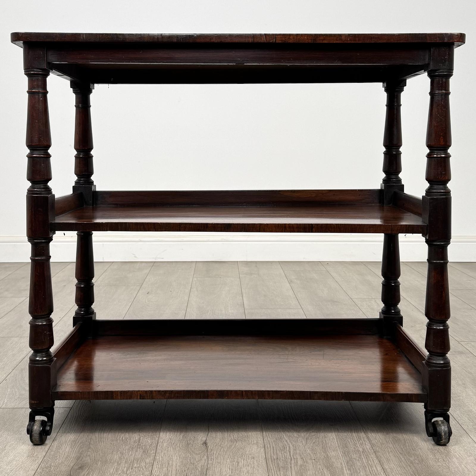 Antique 19th century small Victorian buffet in rosewood, a very well made and finely crafted example full of elegance and character. This highly desirable piece features a classic three-tier design, each tier supported by beautifully turned legs, with the buffet raised on casters for ease of movement and practicality. Each level is finished with a decorative gallery to the edges, enhancing both the visual appeal and functionality of the piece. The rosewood displays stunning grain and rich figuring throughout, showcasing the natural beauty and depth of the timber.