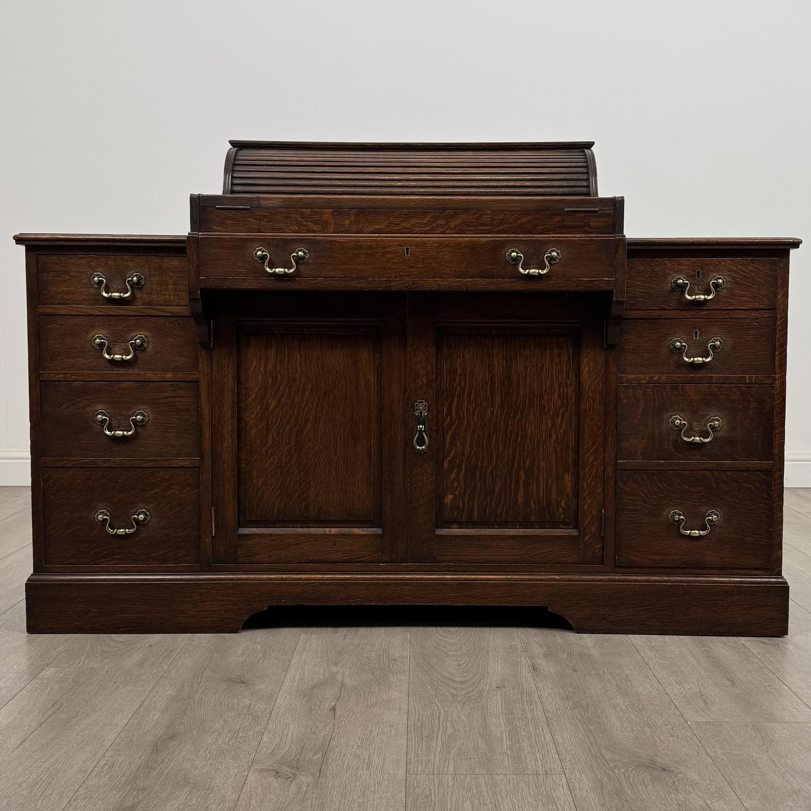 Antique 19th century tambour-top banker’s desk in oak, a highly distinctive and exceptionally well-crafted piece.