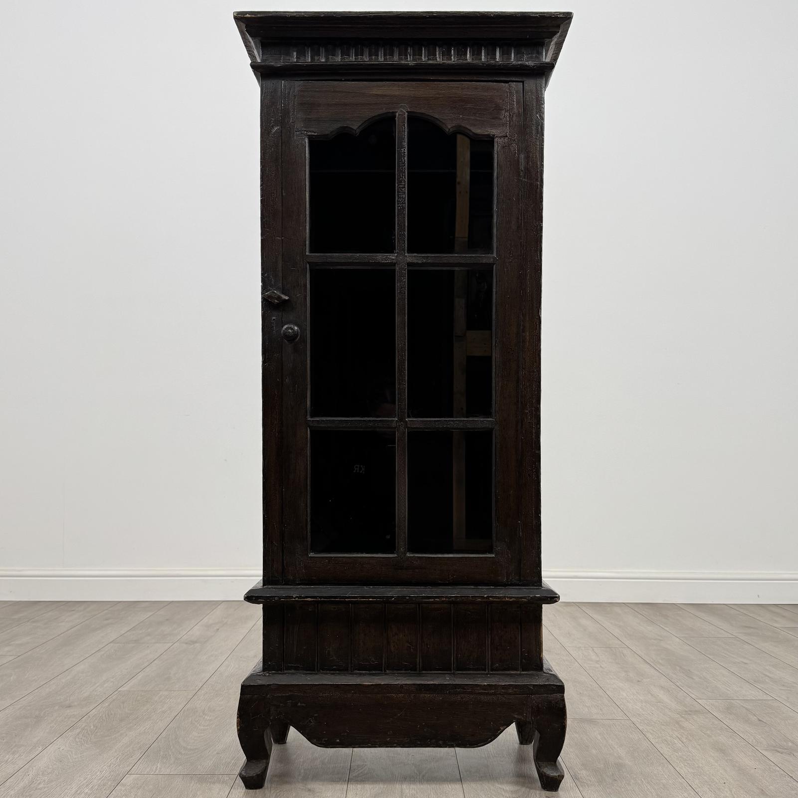 Antique 19th century unique display cabinet in oak, a beautifully characterful and eye-catching piece with a very distinctive design. The cabinet features a glazed front, opening to reveal two fixed shelves on the inside, ideal for displaying decorative items, books, or collectibles.