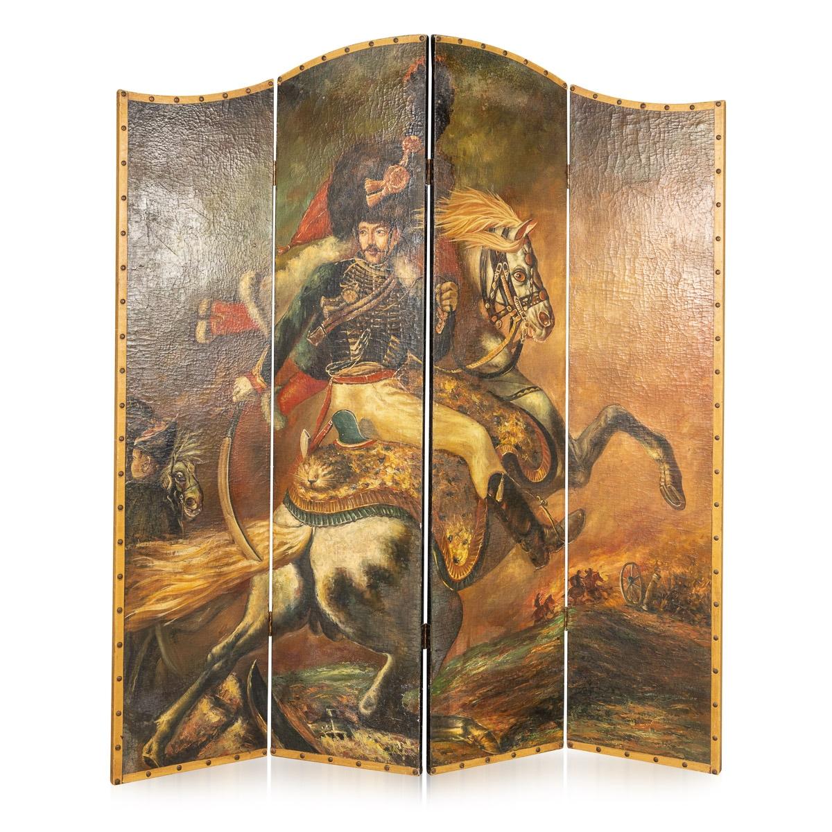 Antique 19th Century Victoria 'Cavalry In Battle' Oil Painted Folding Screen c.1890
