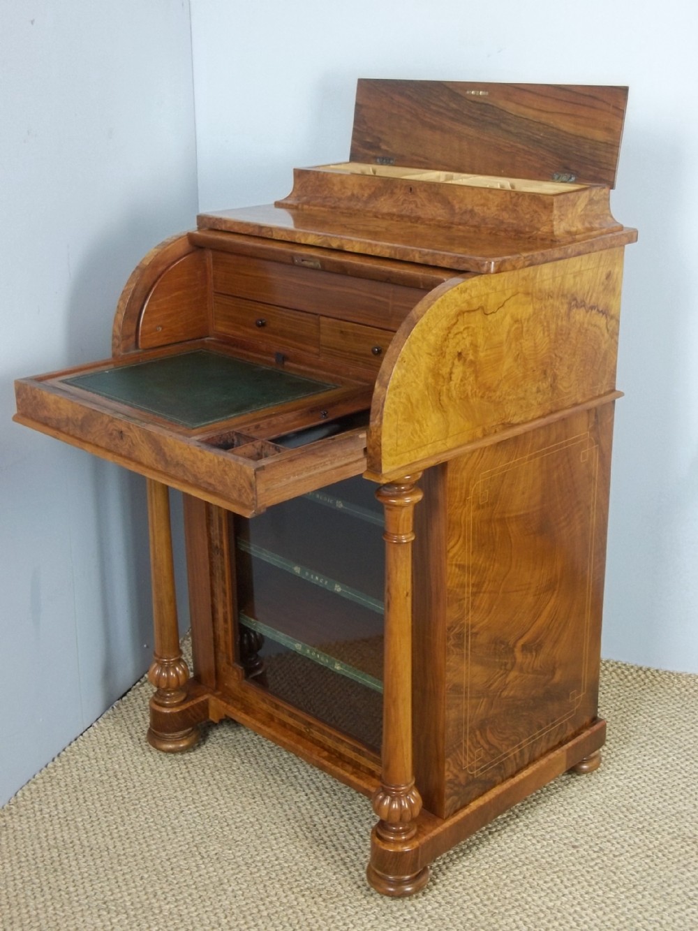 Antique 19th Century Victorian Burr Walnut Marquetry Inlaid Piano Top Cylinder Music Cabinet Davenport