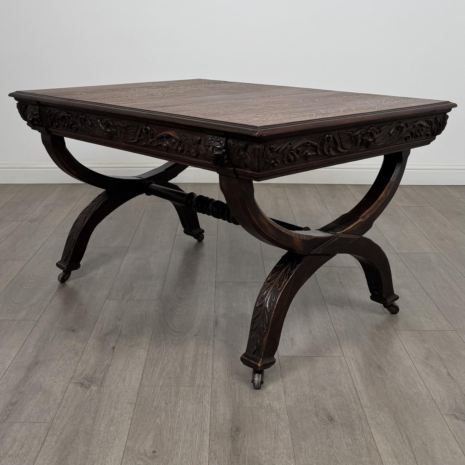 The table is beautifully carved throughout, with particular attention to the frieze, and stands on a distinctive base featuring highly detailed carvings and a turned stretcher. It is fitted with casters for ease of movement.