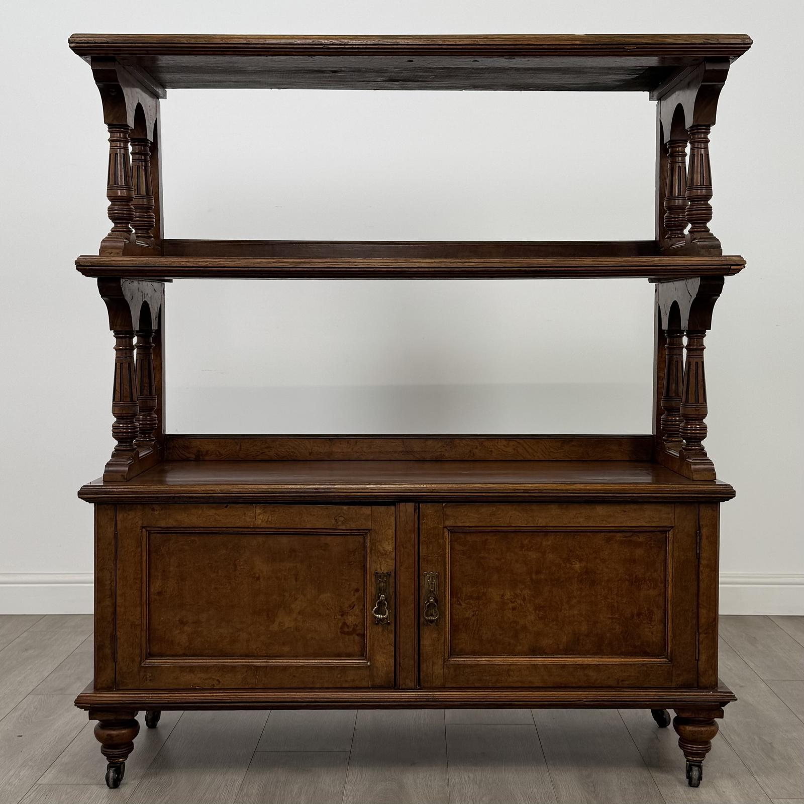 The upper section features two large open shelves, each with a gallery and supported by turned columns, creating a striking and practical display area. Below is a double-door cupboard offering useful enclosed storage.