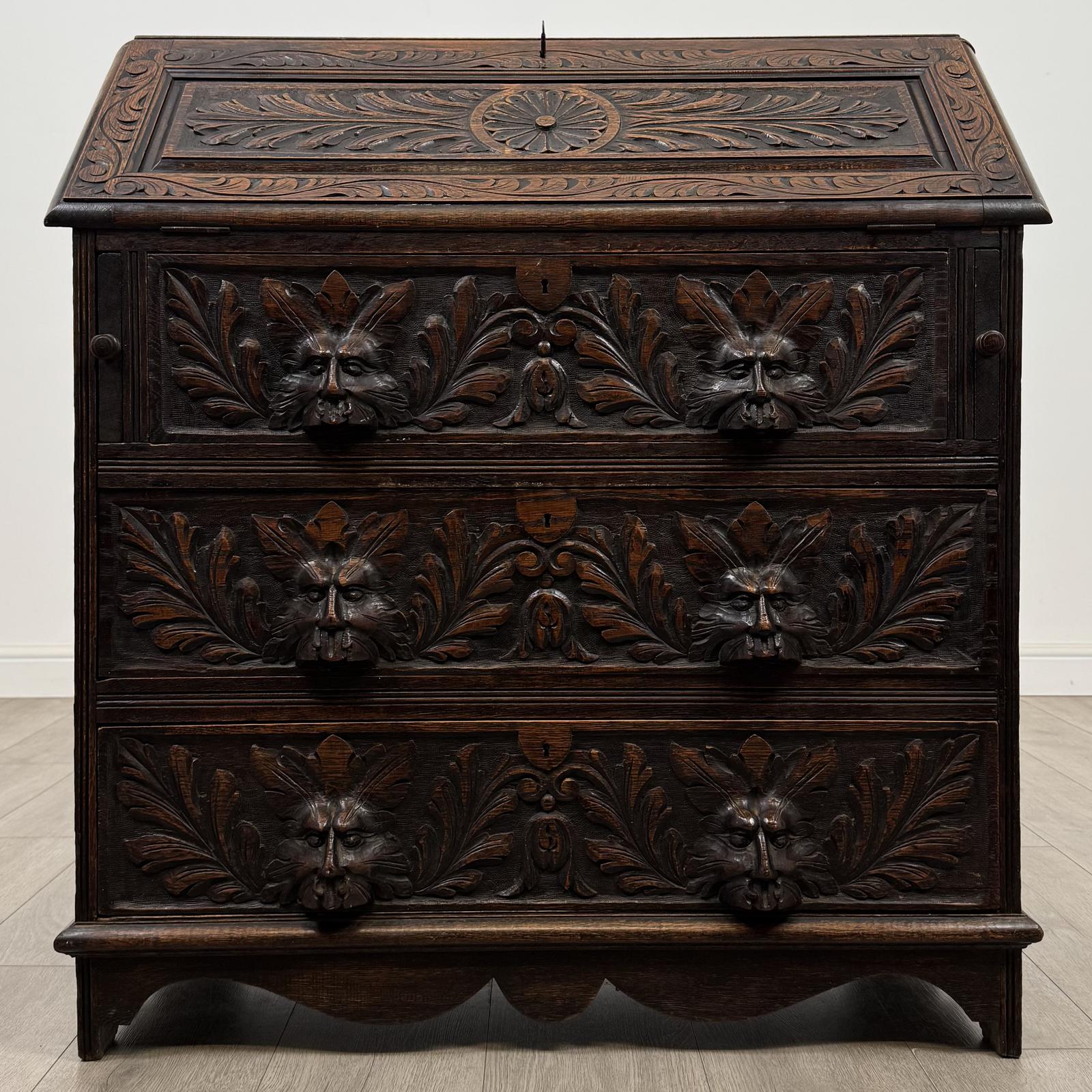 Antique 19th century Victorian Green Man bureau in oak, a very well-made and fine-quality piece.