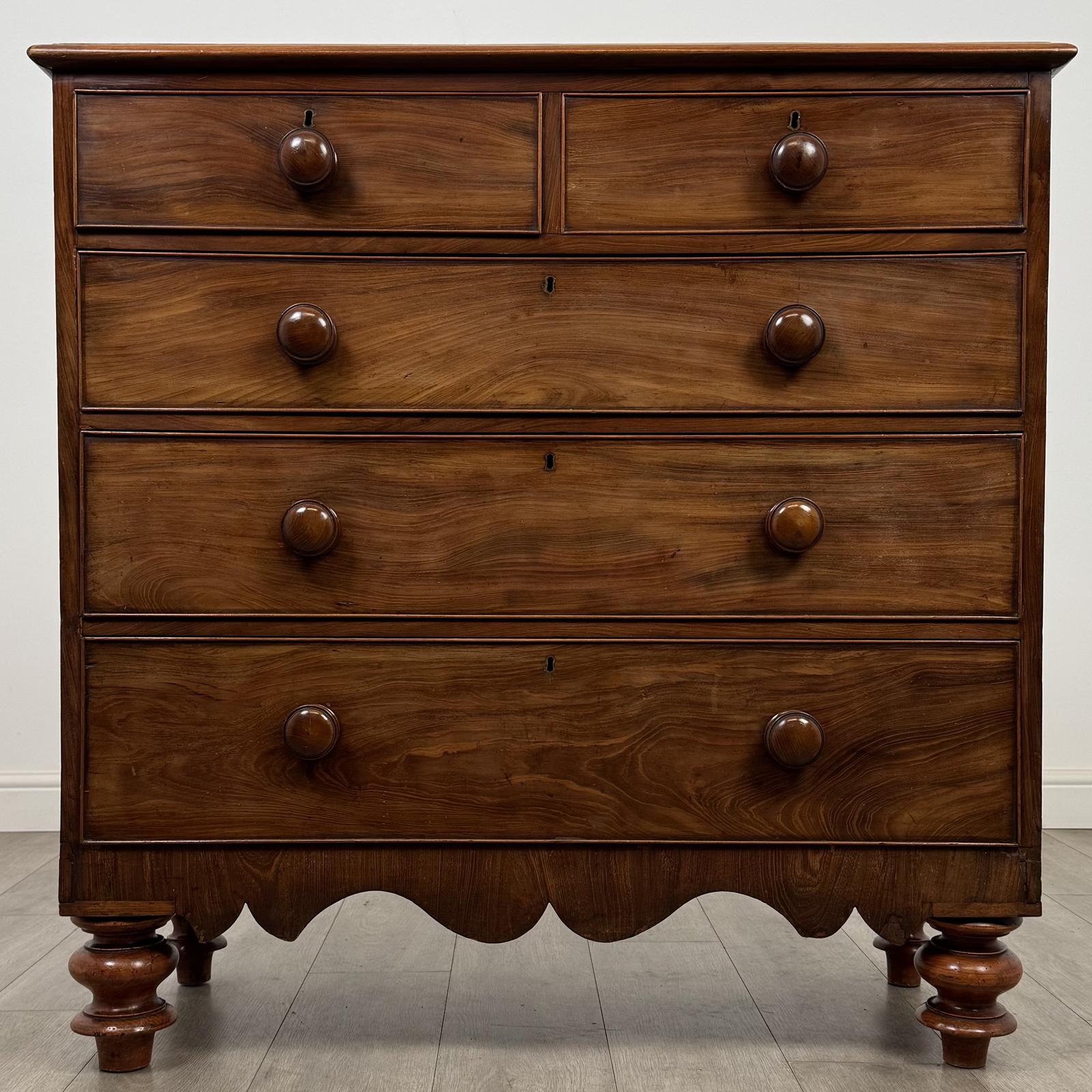 Standing on elegant turned legs, the chest displays beautiful figuring across the drawer fronts along with a rich, warm mahogany grain and colour throughout. The combination of practical storage and refined design makes this a highly functional yet decorative piece.