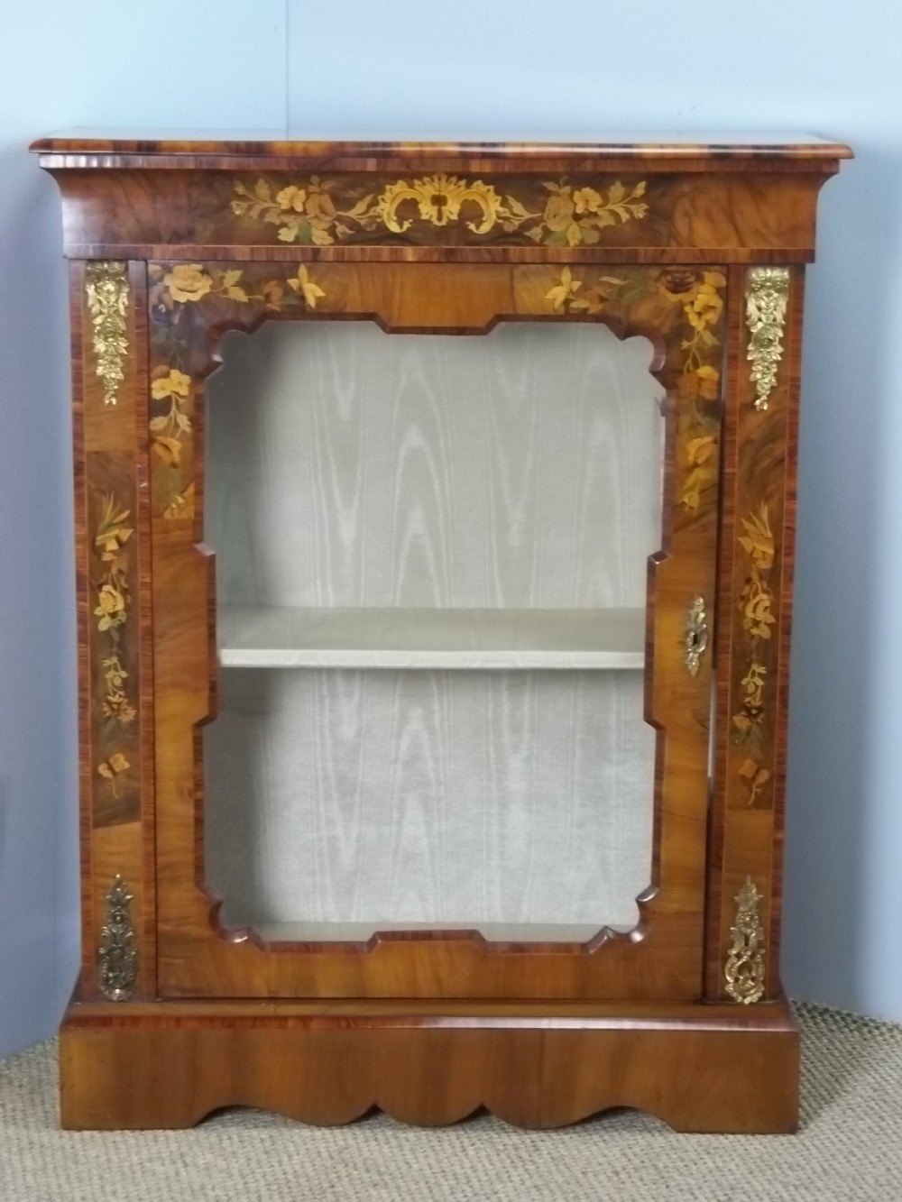Antique 19th Century Victorian Walnut Marquetry Satinwood Inlaid Pier Console Vitrine Display Side Narrow Cabinet Collectors Credenza with Gilt Bronze Mounts