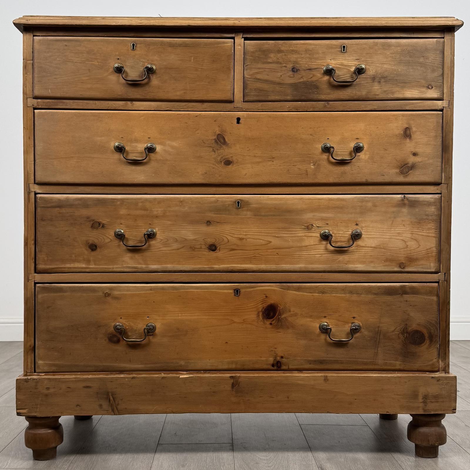 Antique 19th century vintage pine chest of drawers, a charming and characterful example with a wonderfully rustic appeal. The piece features five drawers to the front, all retaining their original brass handles, adding authenticity and period charm. Well made and solid in construction, the chest stands on attractive turned legs which enhance its traditional farmhouse look while providing a pleasing sense of proportion. The pine displays a beautiful warm colour and aged patina, giving the piece a stunning vintage appearance that only improves with time.