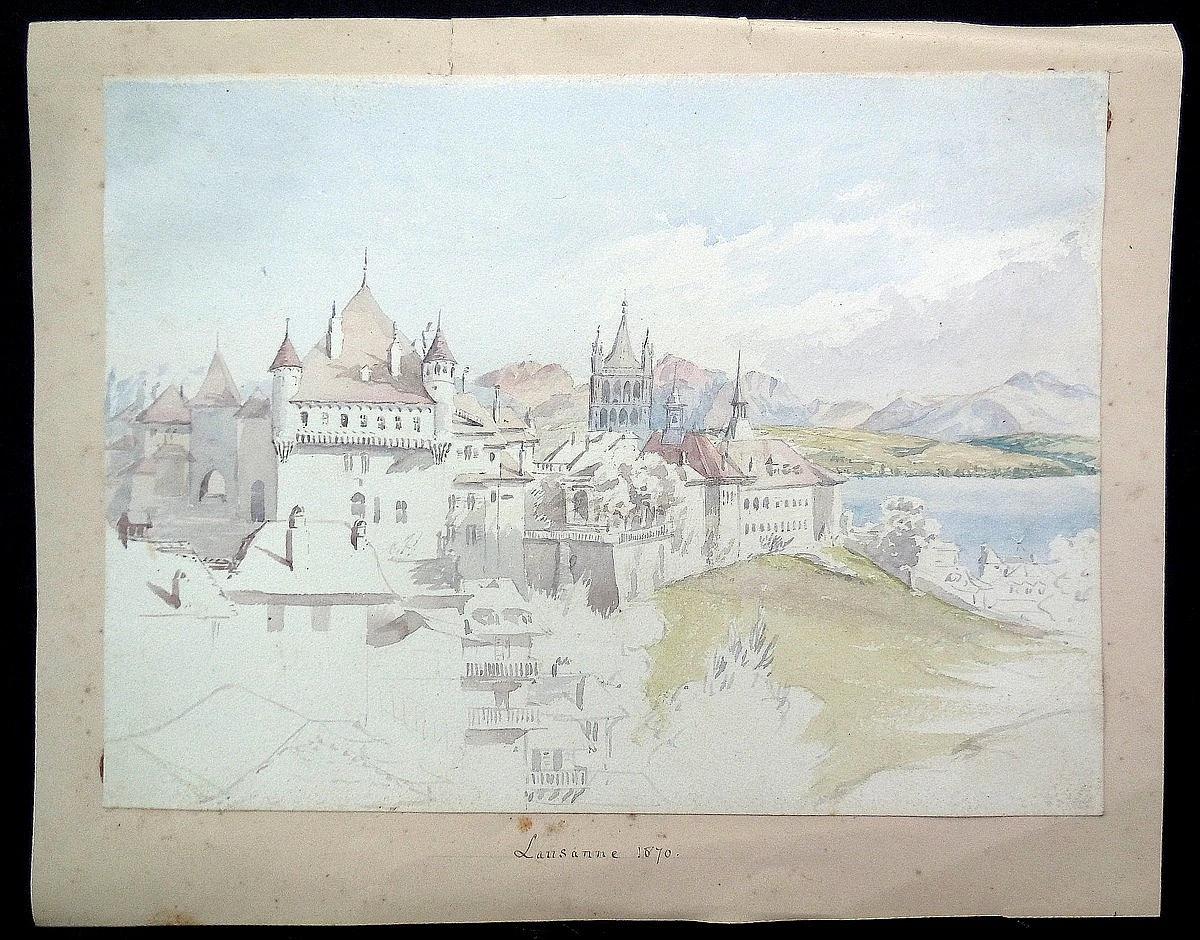 Antique 19th Century Watercolour Painting Switzerland Lake Lausanne 1870 Castle Turrets