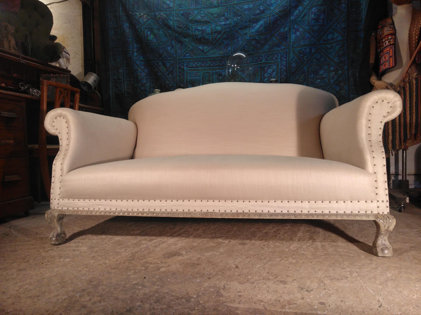 Antique 2 Seater Sofa Raised on Ball & Claw Feet in Washed Oak Uniquely Upholstered in Pure Linen