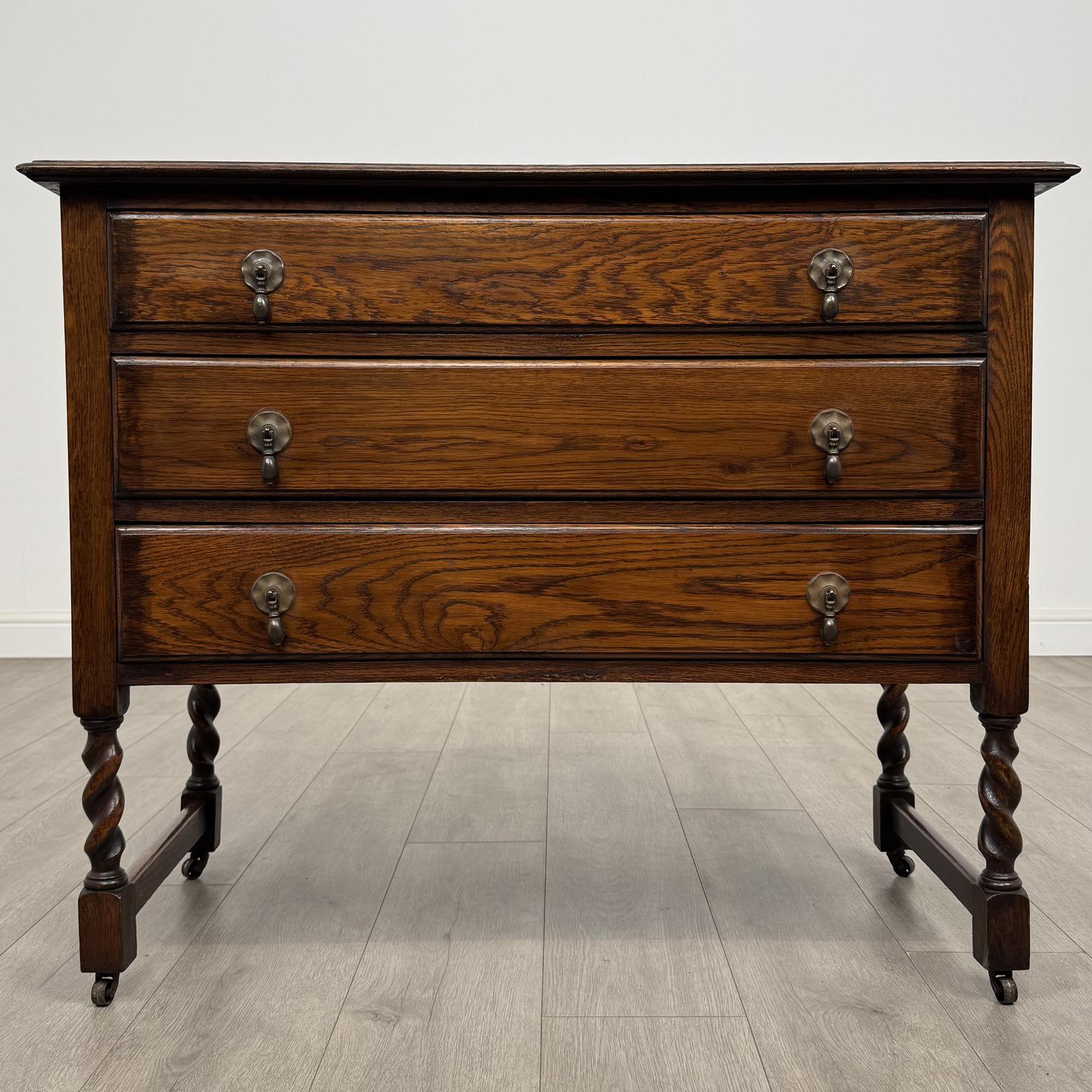 Antique 20th century barley twist chest of drawers in oak, a charming and well-crafted piece of good quality. The chest features three drawers to the front, all retaining their original brass dropper handles, adding to its character and authenticity.