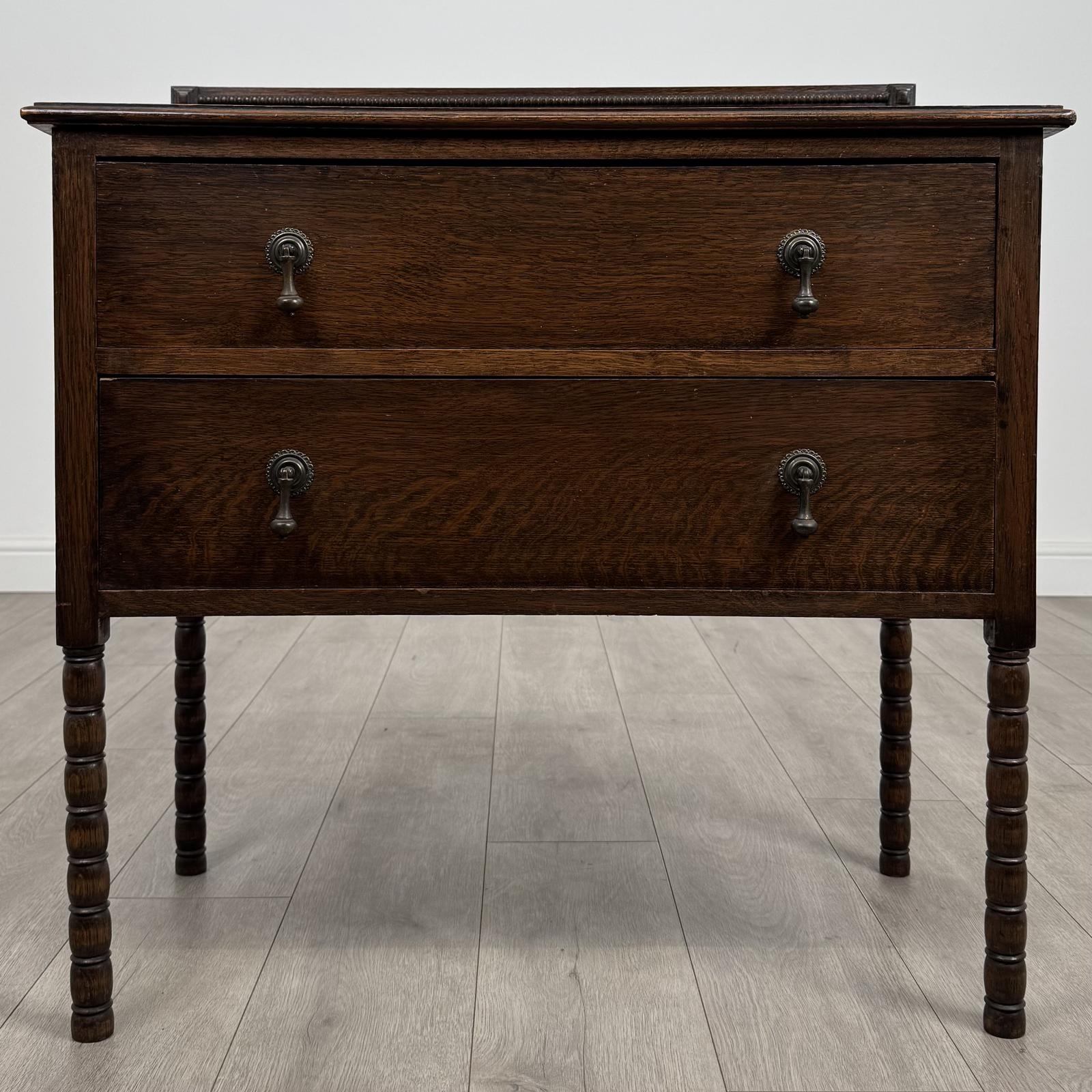 The chest has two drawers to the front, both fitted with their original drop handles, and a raised gallery to the top, which adds both decorative interest and practical detail.