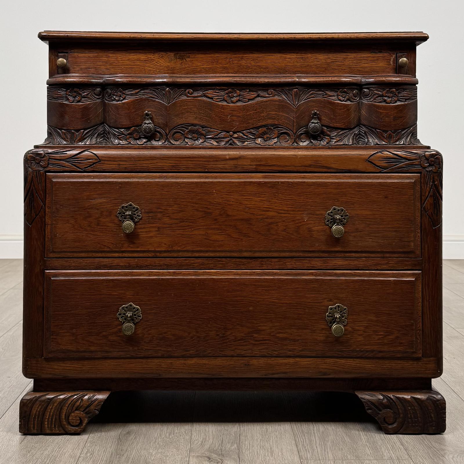 A charming antique early 20th century carved oak chest of drawers, very well made and of good quality throughout.