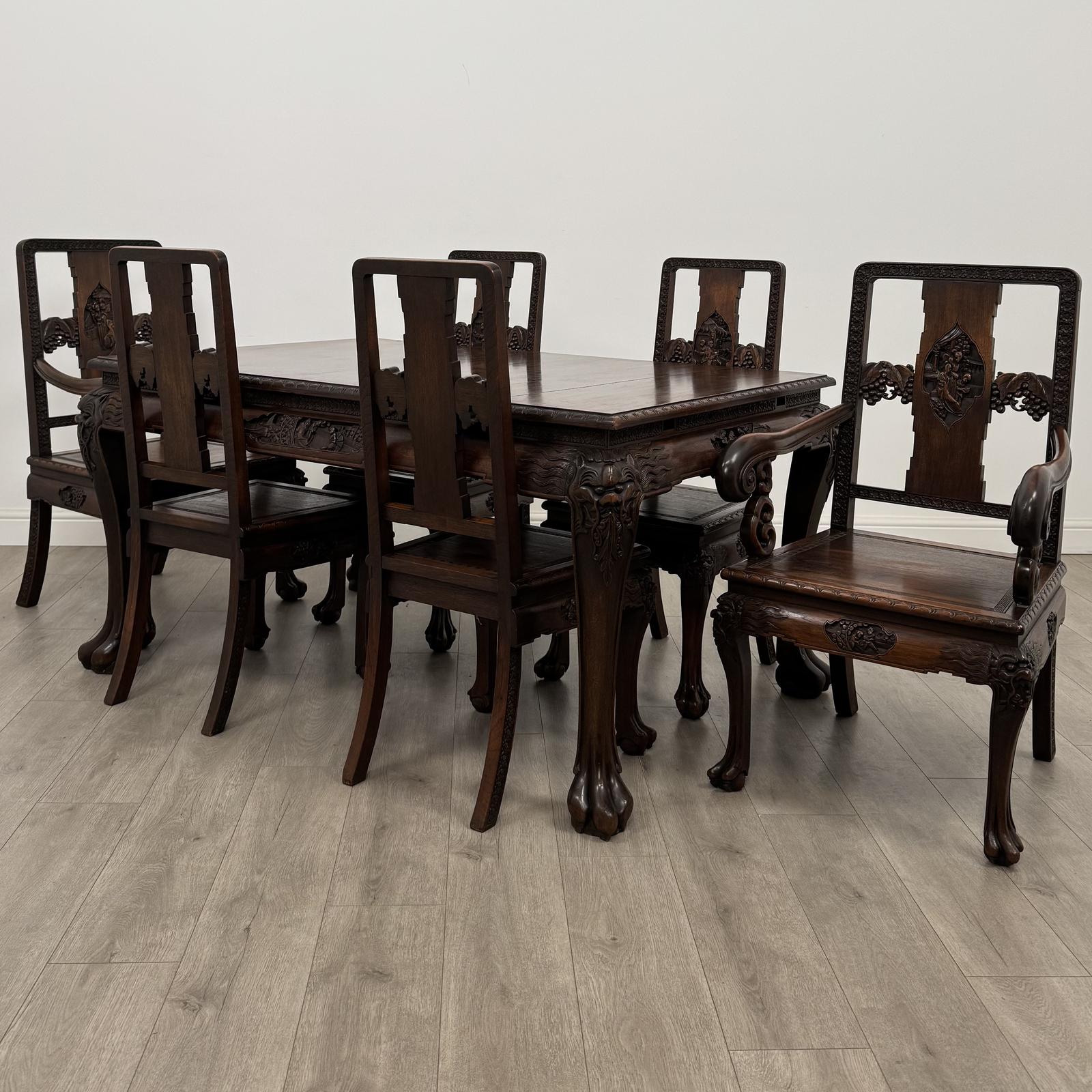 Antique 20th Century Chinese rosewood dining table with six chairs, a stunning and highly desirable dining set of exceptional craftsmanship. Very well made and of the finest quality, the table features a beautifully carved frieze, intricately detailed legs with carved faces at the knees, and exquisite imagery along the sides, showcasing traditional Chinese artistry at its best.