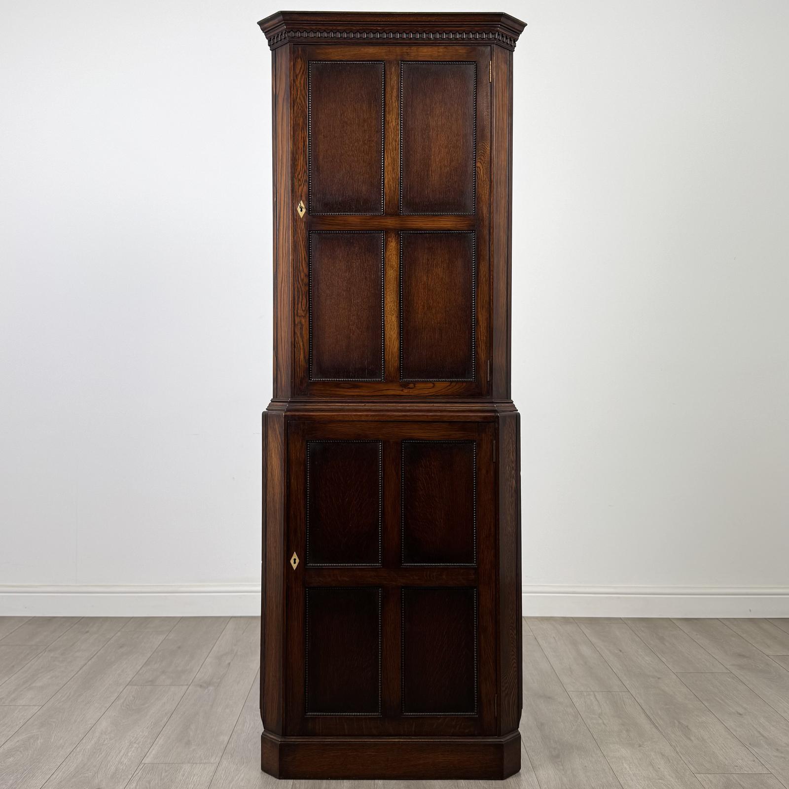 Antique 20th century Edwardian corner cabinet in oak, a very well-made piece of good quality, showcasing fine craftsmanship.
