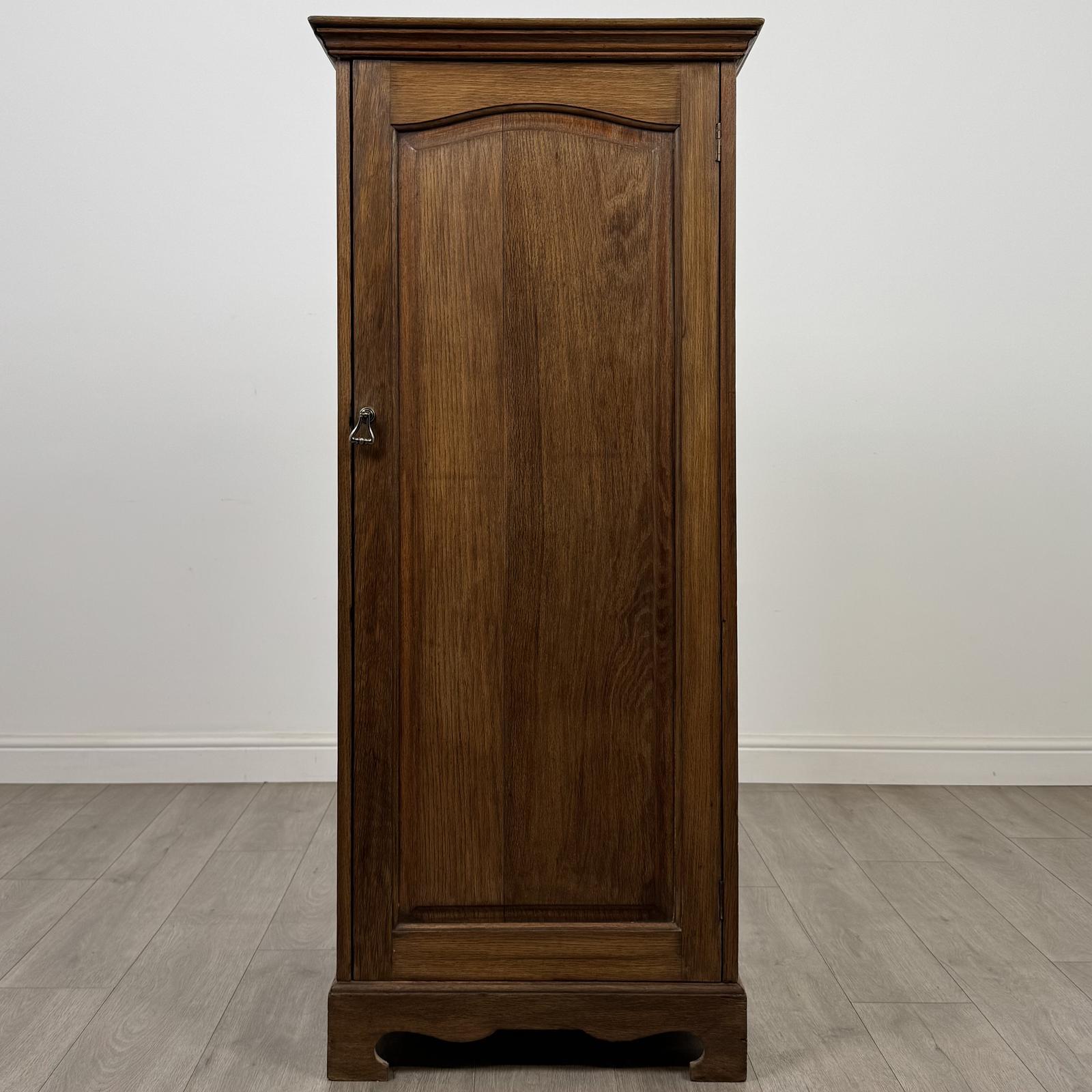 A charming antique 20th century Edwardian cupboard in oak, very well made and of good quality, displaying attractive craftsmanship throughout. The cupboard features a single front door with its original handle, opening to reveal two internal shelves, providing useful storage space.