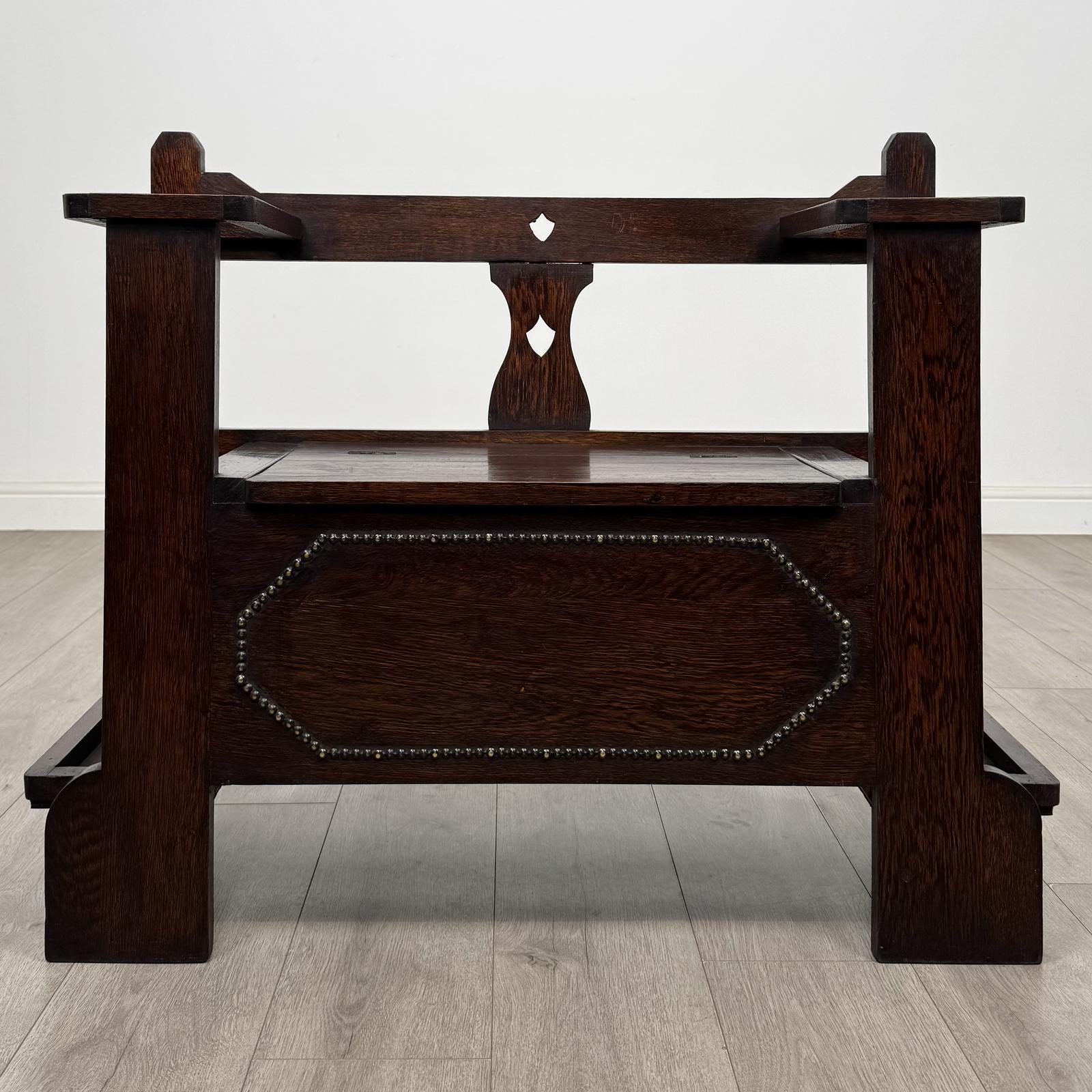 A charming antique 20th century Edwardian hall seat in oak, very well made and of good quality, displaying attractive craftsmanship and practical design throughout.