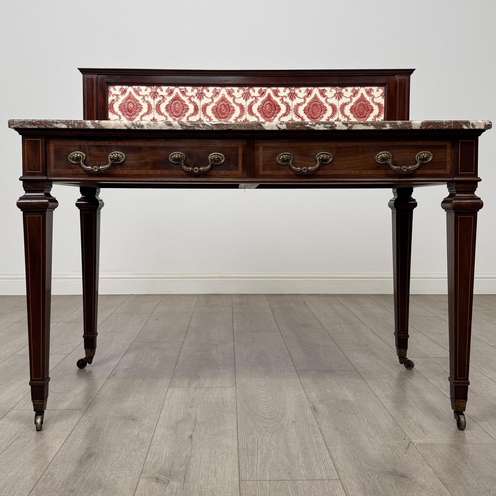 The washstand features a beautiful raised gallery to the top, adorned with decorative tiles, and a polished marble top, offering both style and practicality.