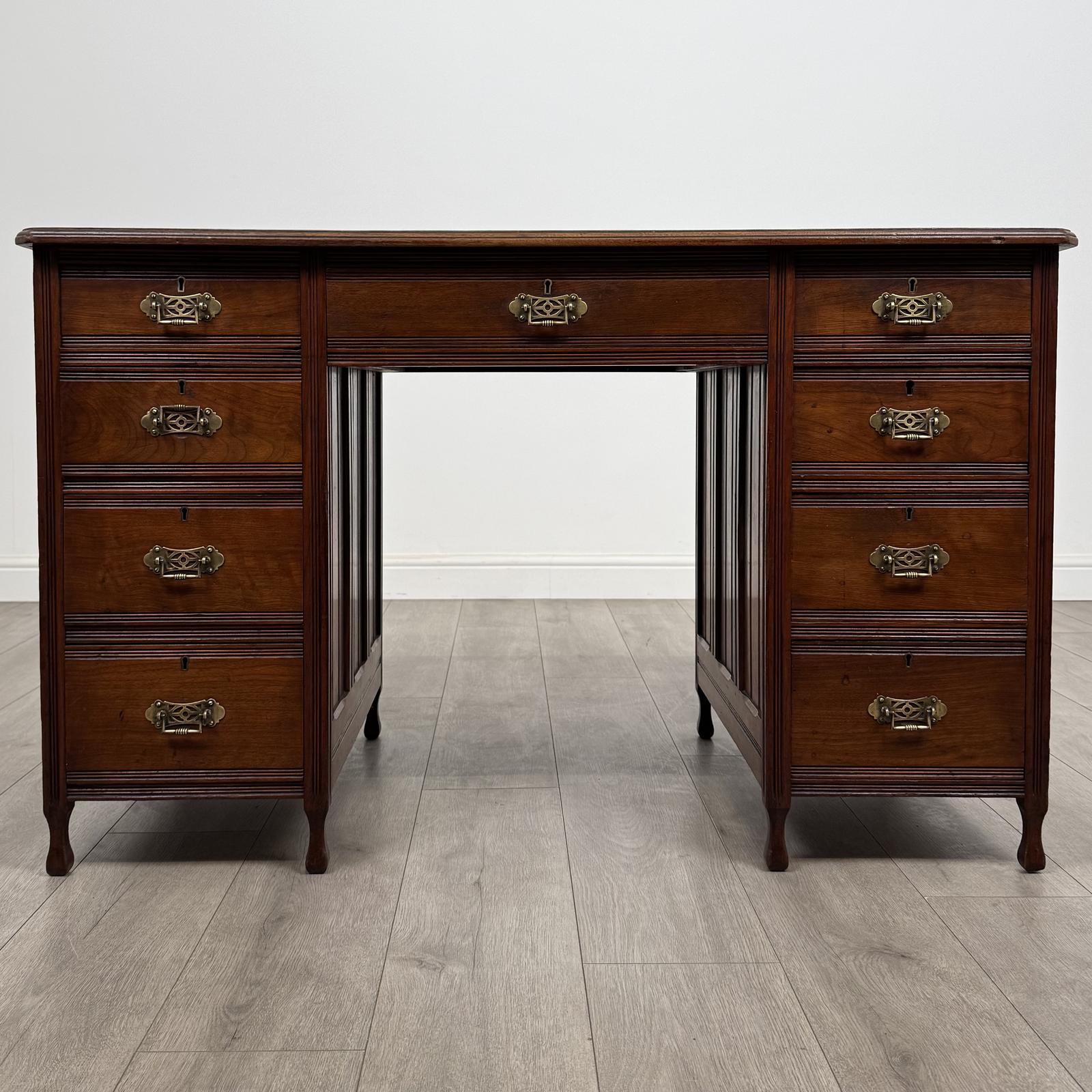 The desk features nine drawers in total, arranged as four on either side with one large central drawer, all fitted with their original brass handles, offering excellent storage and functionality.