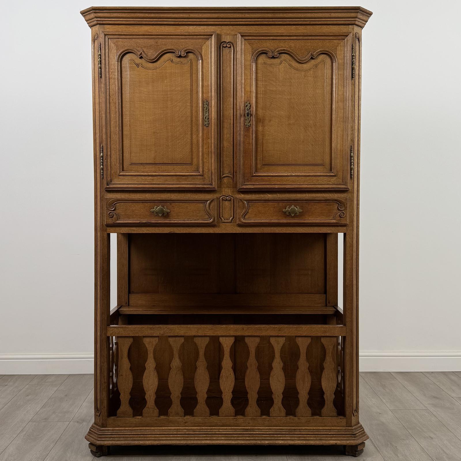 An antique 20th century French oak cupboard of fine quality and exceptional craftsmanship. Very well made and solidly constructed, this unique and highly desirable piece features a double-door cupboard to the upper section with two adjustable shelves inside, two central drawers, and a large storage compartment to the base, offering excellent and versatile storage.