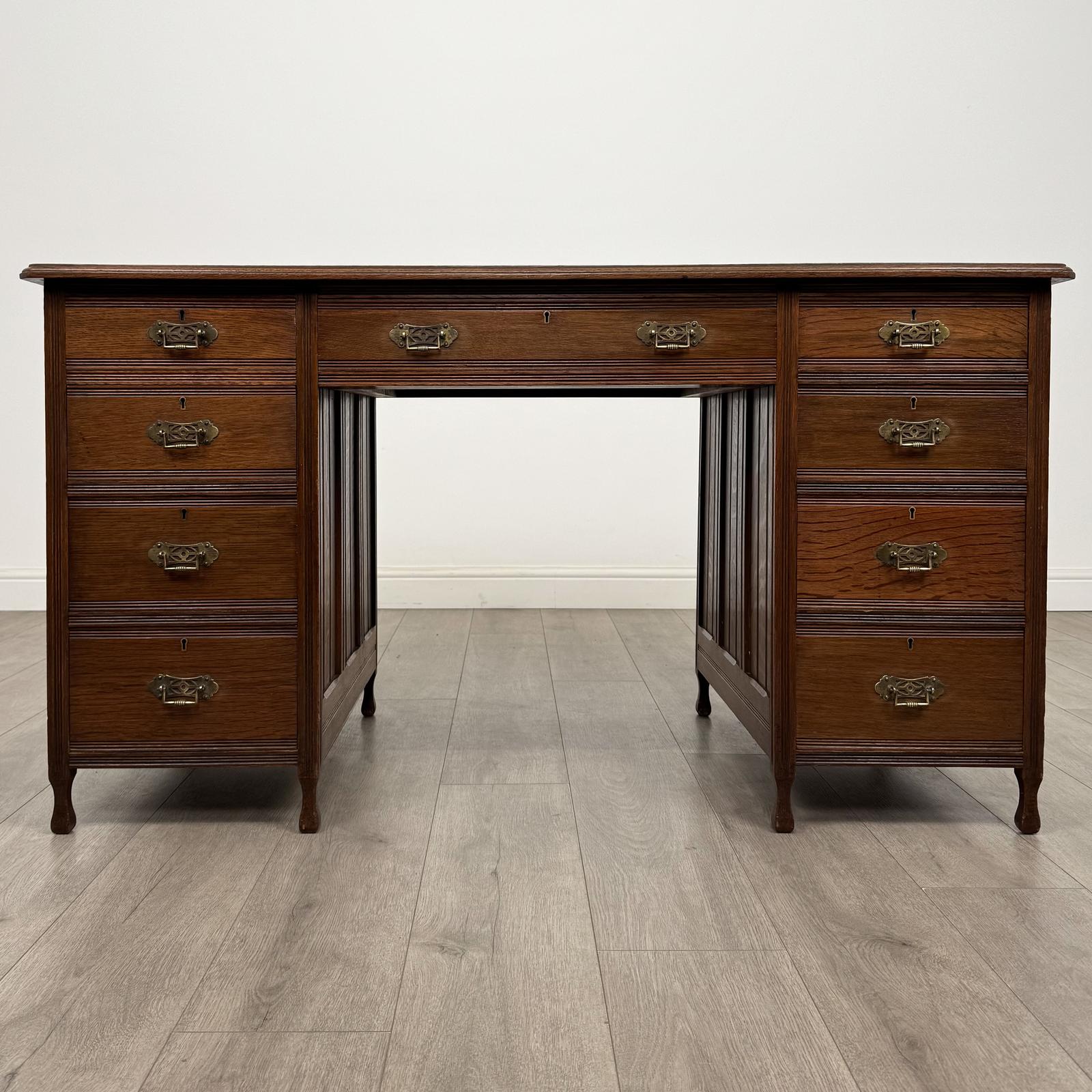 The writing surface is finished with a beautiful green leather top, and the desk features nine drawers in total, arranged as four on either side with one larger drawer to the centre. All drawers retain their original brass handles, adding to the authenticity and character of the piece.