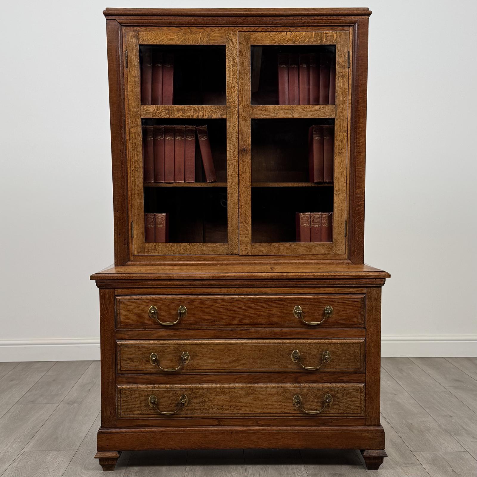 Antique 20th Century fine quality display cabinet in oak. The upper section features a glazed front with two internal shelves, ideal for displaying ornaments or collectibles, while the lower section has three drawers, all retaining their original brass handles. Stood on decorative feet, this piece is a unique and highly desirable small size example.