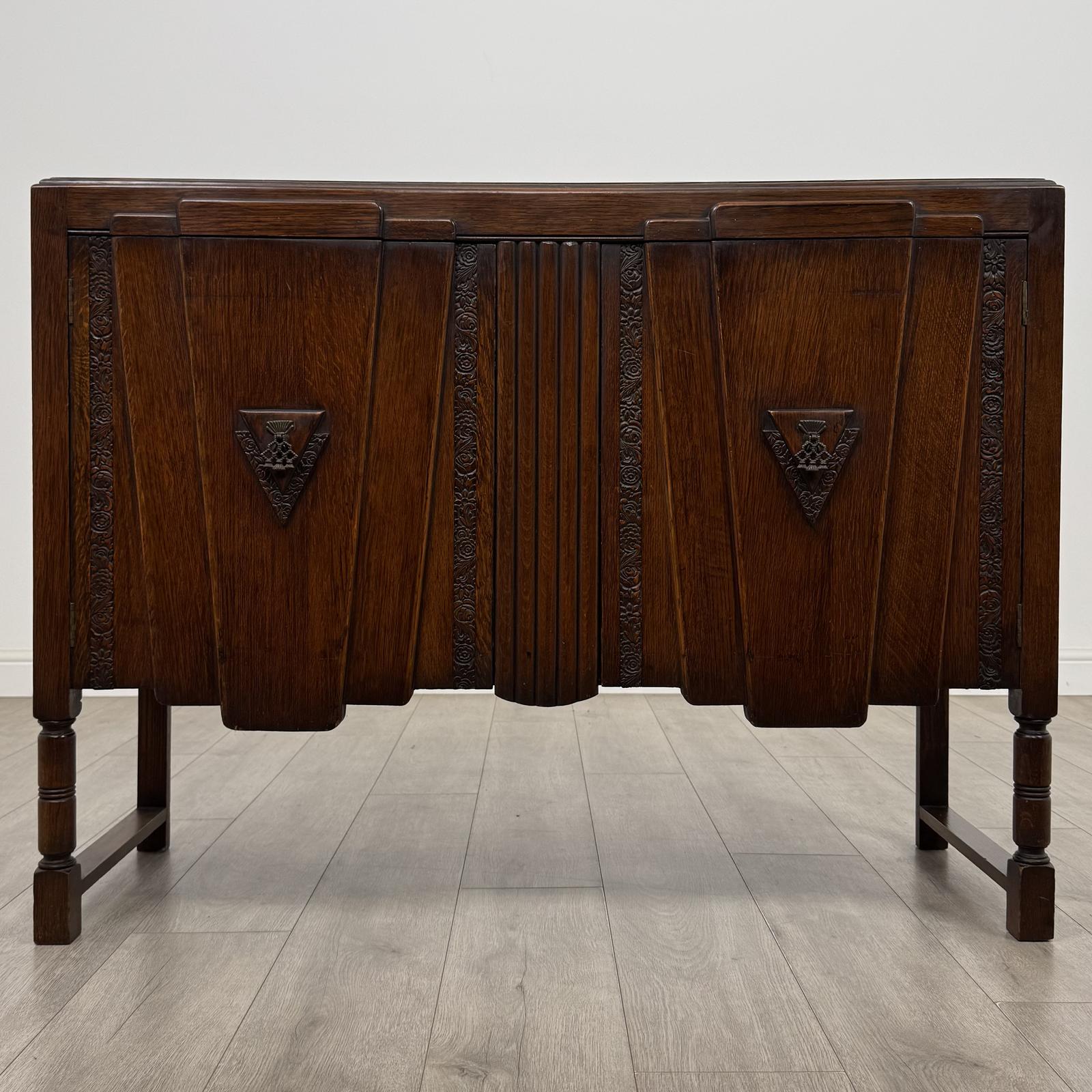 A charming antique early 20th century Edwardian fitted oak sideboard, very well made and of good quality throughout. This elegant piece features two doors to the front, opening to reveal a beautifully fitted and practical interior. The left-hand side includes two drawers with a shelf below, while the right-hand side offers a single central shelf, providing versatile storage options. It displays a gorgeous oak grain and warm rich colour throughout, enhanced by its original handles and fittings, adding authenticity and period charm. The raised gallery to the top is finely carved with subtle decorative detailing, further enhancing its classic Edwardian appeal.