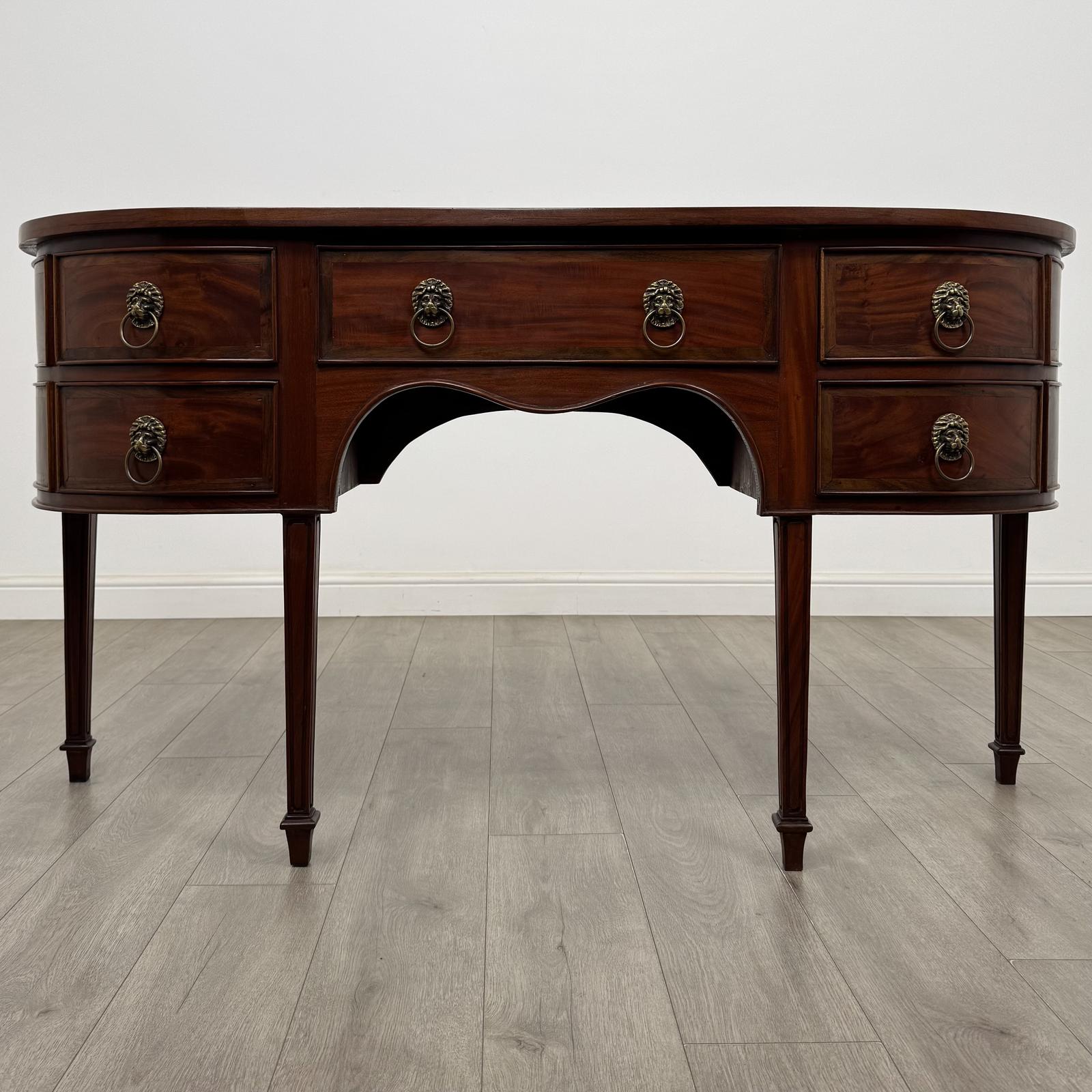 It has five drawers in total, arranged as two on either side with a large central drawer, all fitted with highly detailed brass lion handles that enhance its decorative appeal.