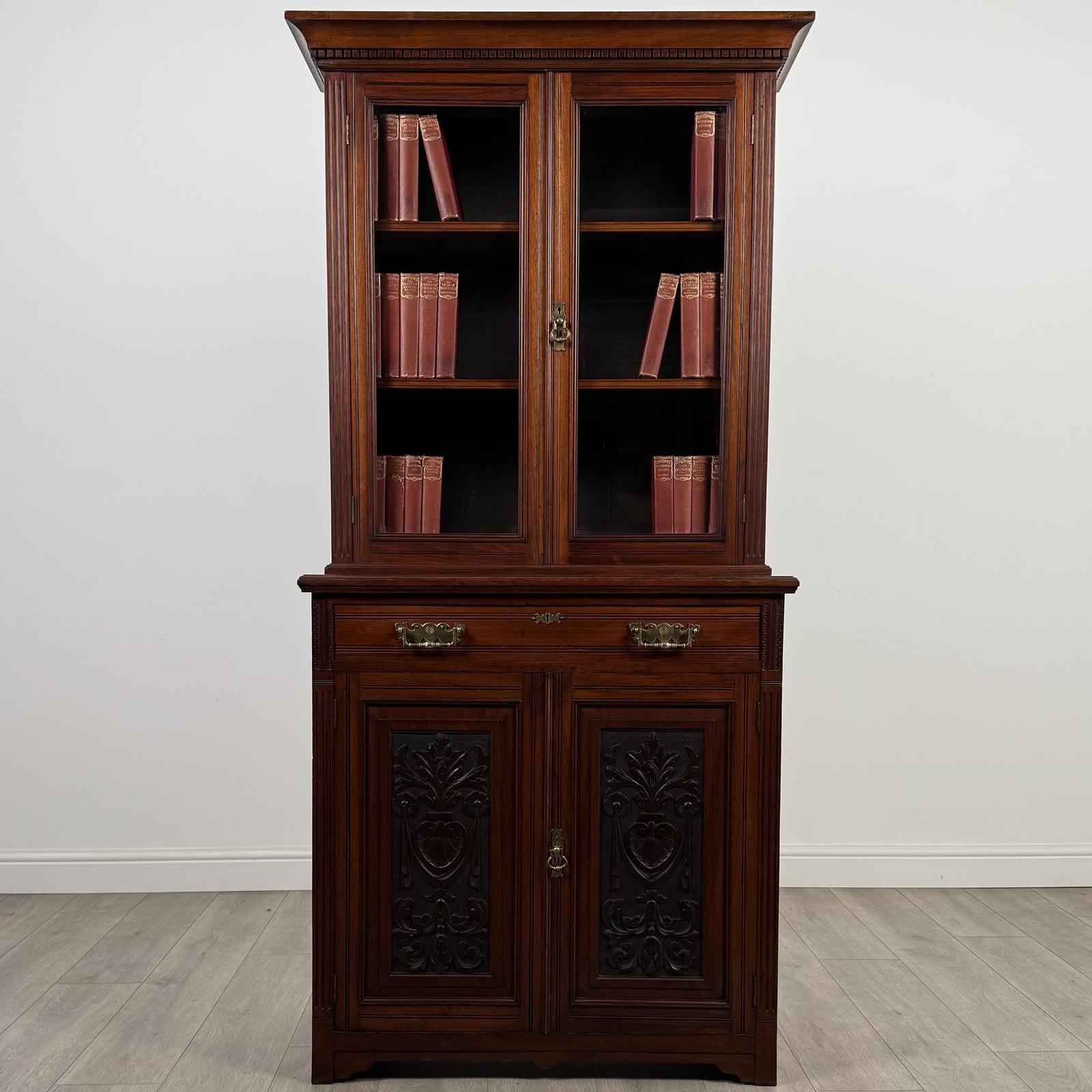 Antique 20th century good quality bookcase in walnut, a beautifully crafted and highly desirable piece. The glazed upper section features two adjustable shelves, ideal for displaying books or decorative items, while the centre drawer and blind door cupboard to the base, with a single internal shelf, provide practical storage. The bookcase retains all of its original brass handles and fittings, adding authenticity and charm. The front is beautifully carved, showcasing fine craftsmanship, and the walnut displays a gorgeous grain and rich colour throughout.