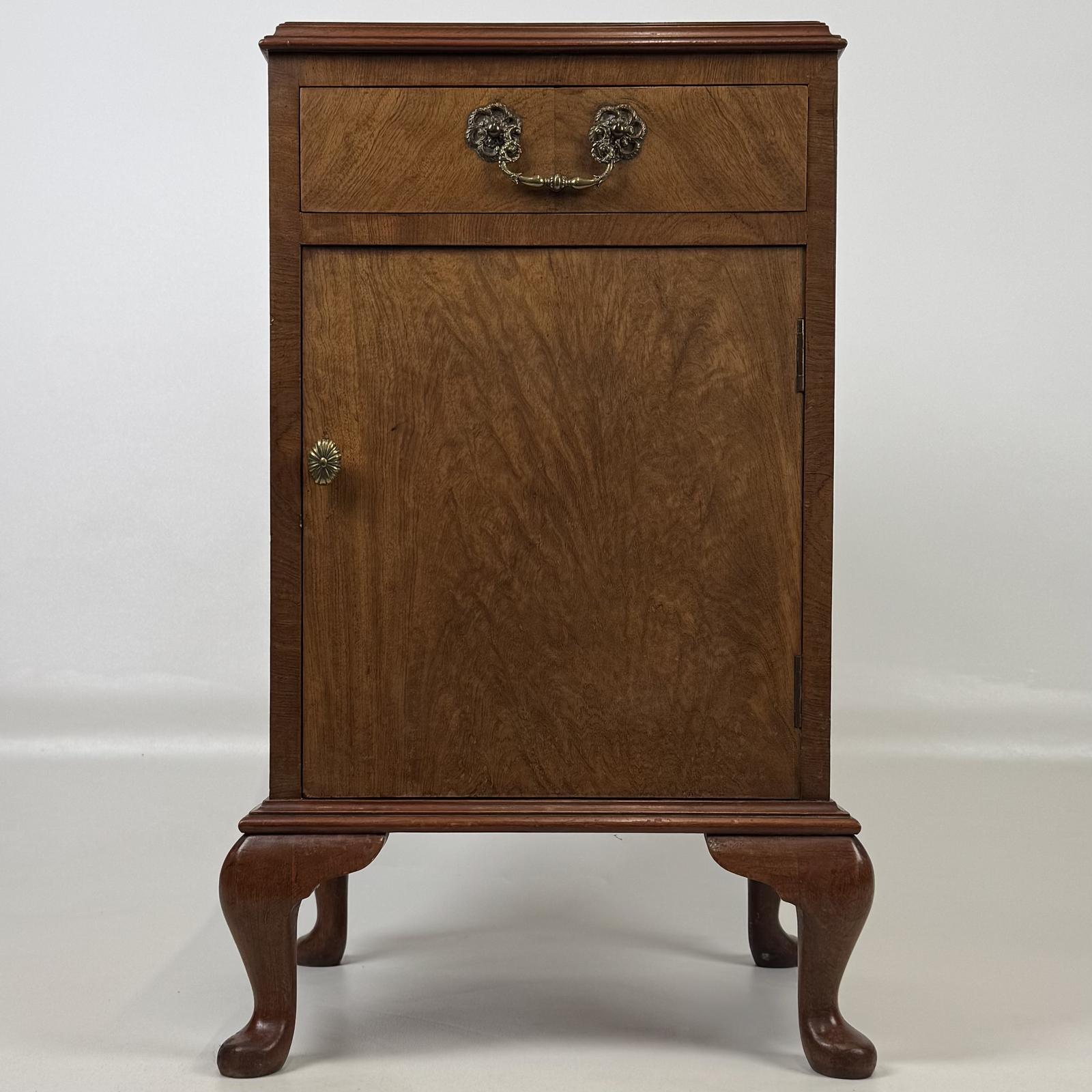 A raised gallery to the top adds character, while the cabinet stands on elegant cabriole legs, enhancing its overall proportions. The walnut displays beautiful grain and rich colour throughout, and the piece retains its original handles and fittings.