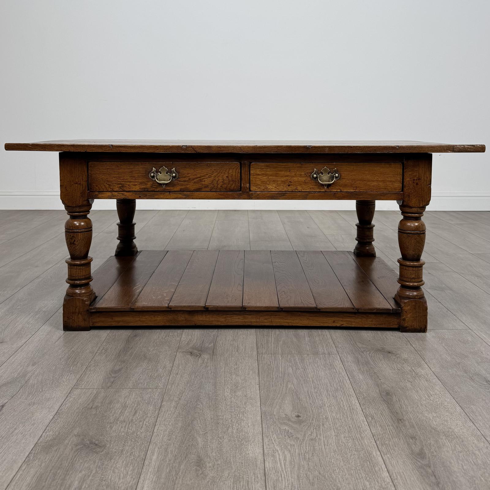 An antique 20th Century oak coffee table of good quality and fine craftsmanship. The table features two drawers to the top, each fitted with its original brass handles, and stands on turned supports with a shelf to the base, combining practicality with elegant design. The oak displays gorgeous grain and rich colour throughout, highlighting the quality of the timber. Very well made and solidly constructed, this desirable coffee table is both functional and stylish, making it a perfect addition to any home.