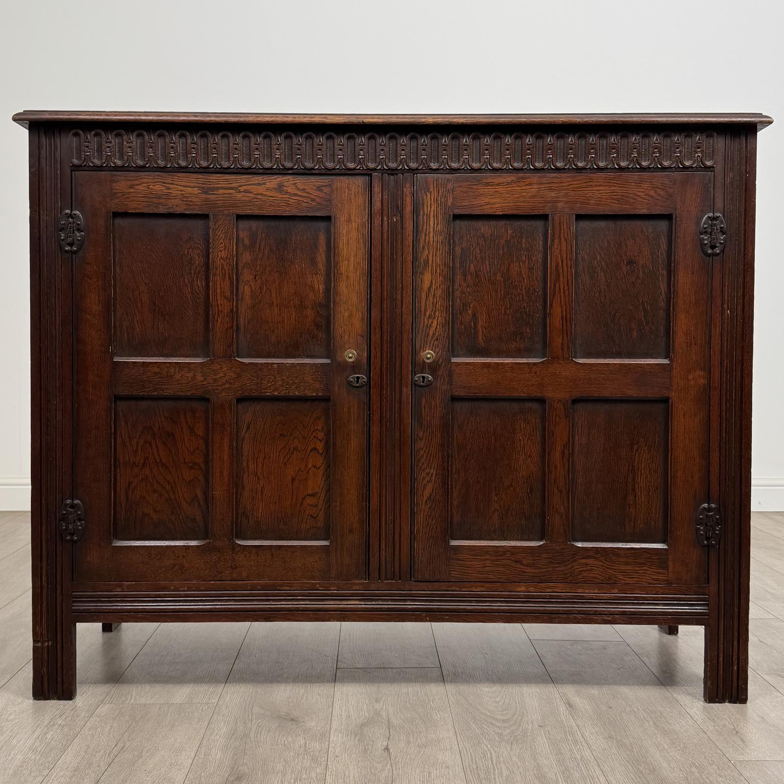 Beautifully carved to the front, with decorative patterns to the upper section, the cupboard showcases skilled craftsmanship and adds subtle elegance. The original metal hinges remain intact, enhancing its authenticity and period charm. The oak displays gorgeous grain and rich colour throughout, highlighting the quality of the timber.