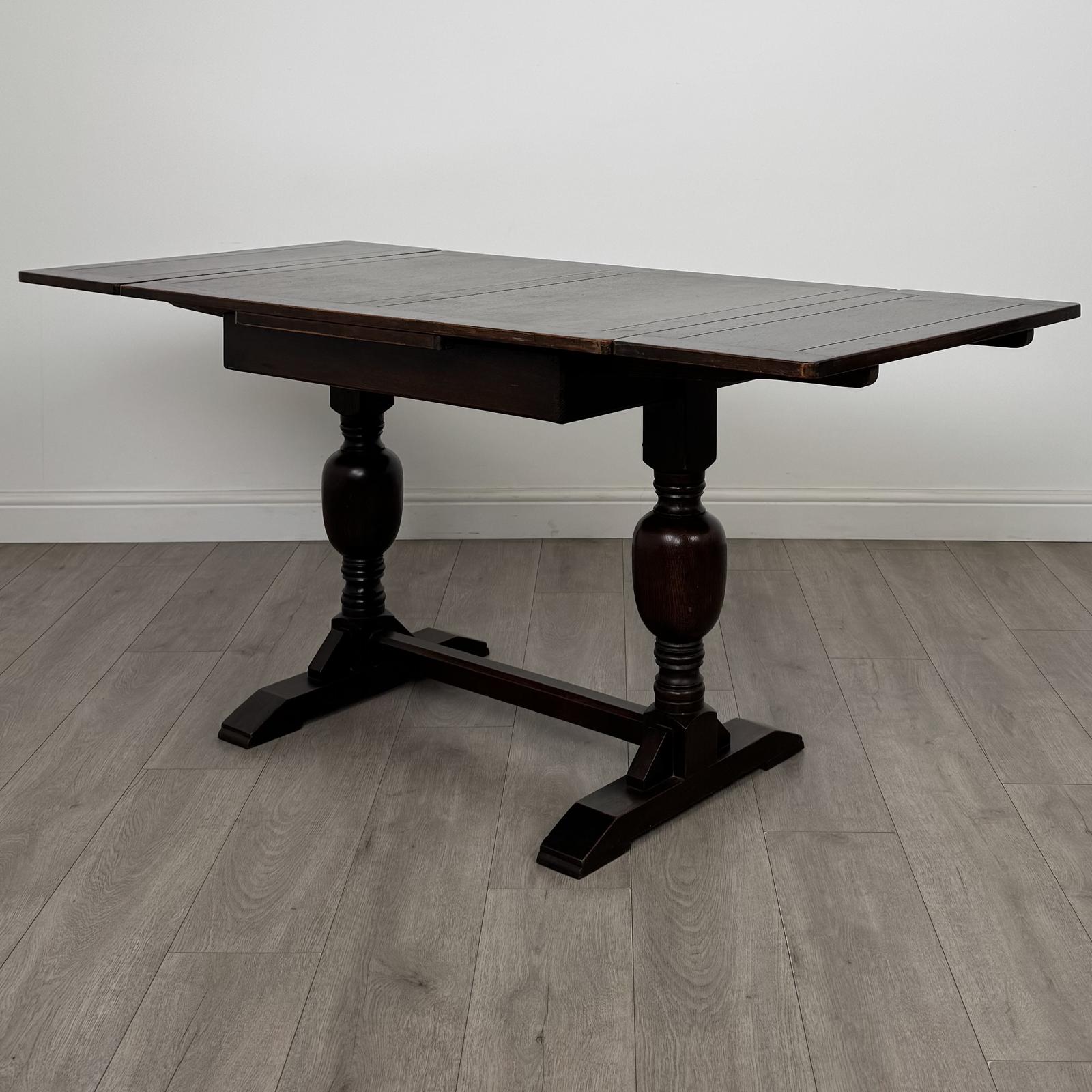 Compact in size, it is ideal for smaller dining spaces while still offering flexibility with its draw-leaf design. The table stands on turned legs with a supporting stretcher across the middle, providing both stability and a classic decorative touch.