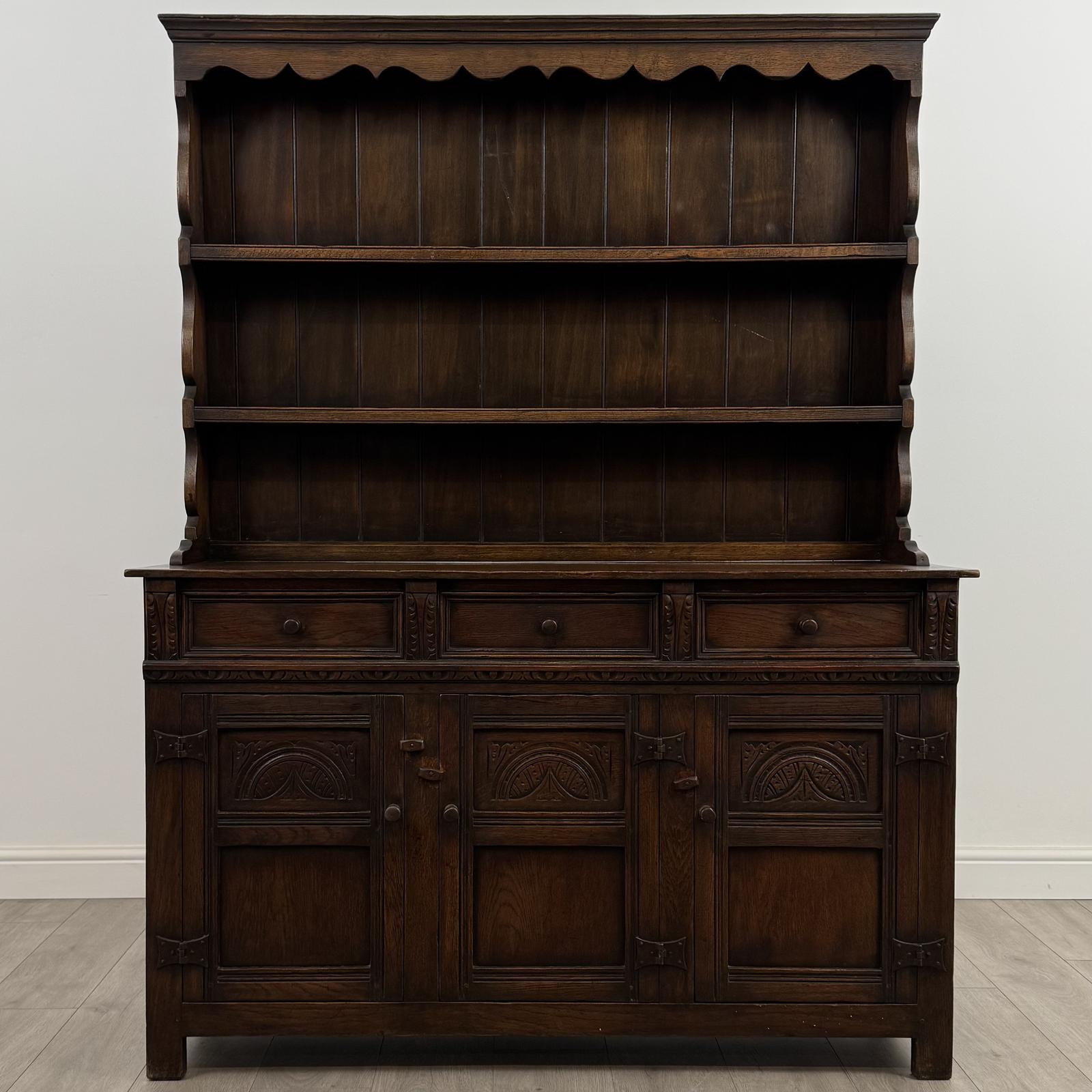 Beautifully carved with a high attention to detail, the dresser stands on sturdy square legs and comes apart into two sections for ease of transport. Crafted from oak, it displays gorgeous grain and rich colour throughout. A very well made and desirable example, presented in good condition, this dresser is a practical, elegant, and perfect addition to any home.
