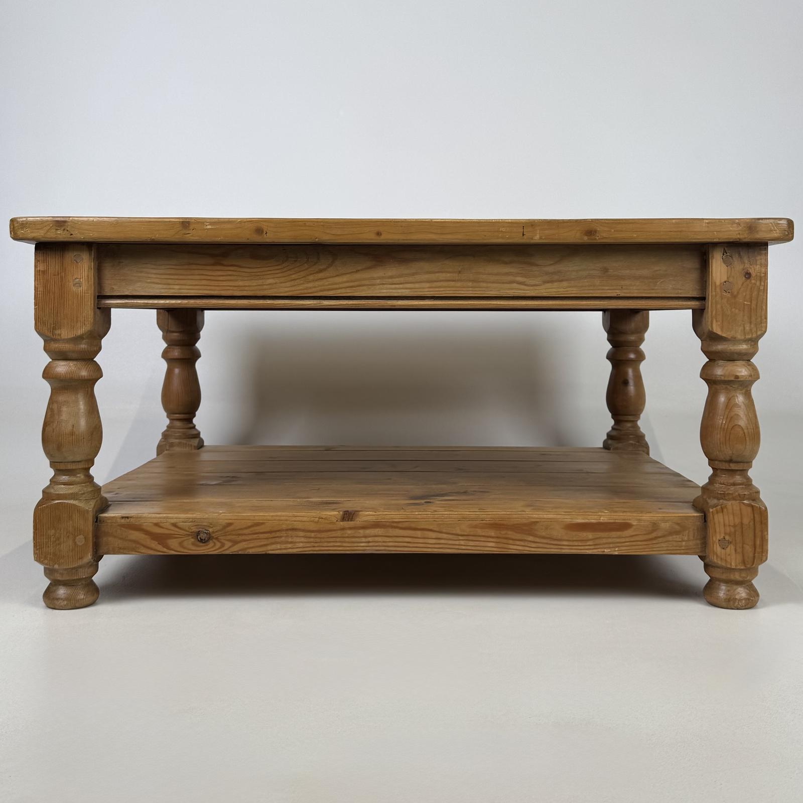 Antique 20th Century good quality pine farmhouse coffee table, having a chunky solid top supported by turned legs and a practical shelf to the base, providing both style and storage. Stood on sturdy bun feet, this table displays a gorgeous grain and rich colour throughout, giving it a beautifully rustic and charming farmhouse appearance.