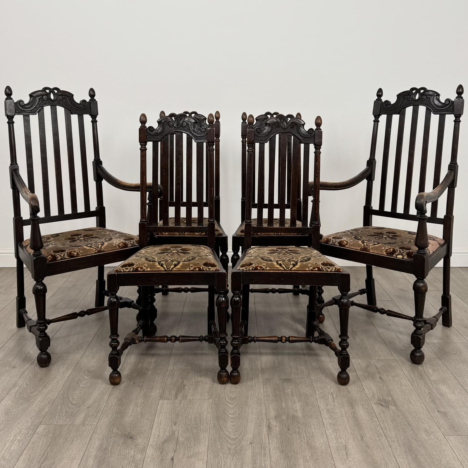 The set comprises four single chairs and two carvers, all standing on turned supports with a central cross stretcher for added stability.